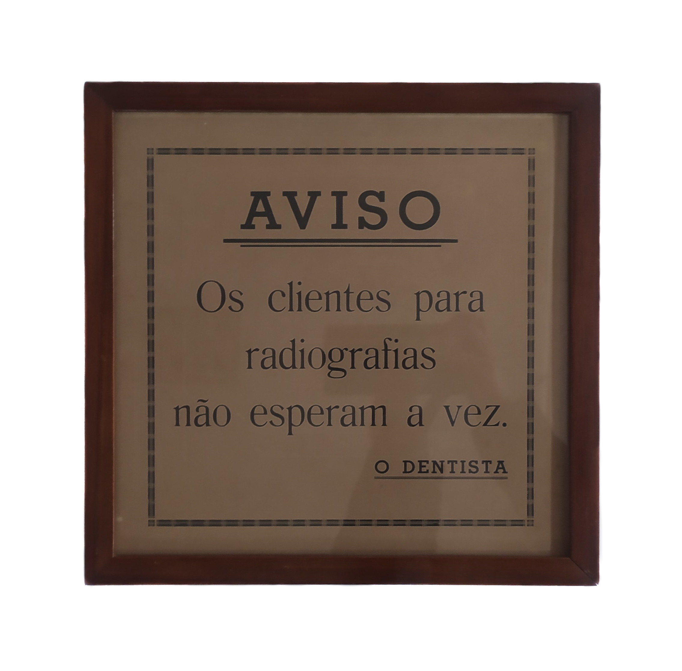 Aviso emoldurado Voltar 14 de junho de 2023 by Museu Municipal Atílio Rocco Documento Baixar Anexos Altura da moldura Detalhe da moldura Verso da moldura Miniatura Compartilhe TítuloAviso emolduradoDescriçãoAviso emoldurado com mensagem para pacientes do dentista. Moldura de madeira em formato quadricular na cor marrom.Dimensões da moldura27,6 x 27,3 x 1,3 cmCategoriaMolduraCromiaColoridaModo de incorporaçãoDoaçãoDoador | Vendedor:Clementino ZétolaData de aquisição | Doação15/09/1989 Continuar navegando Documento histórico emoldurado Fotografia emoldurada de Satozi Ito e Shino Nakamura Voltar para a lista de itens