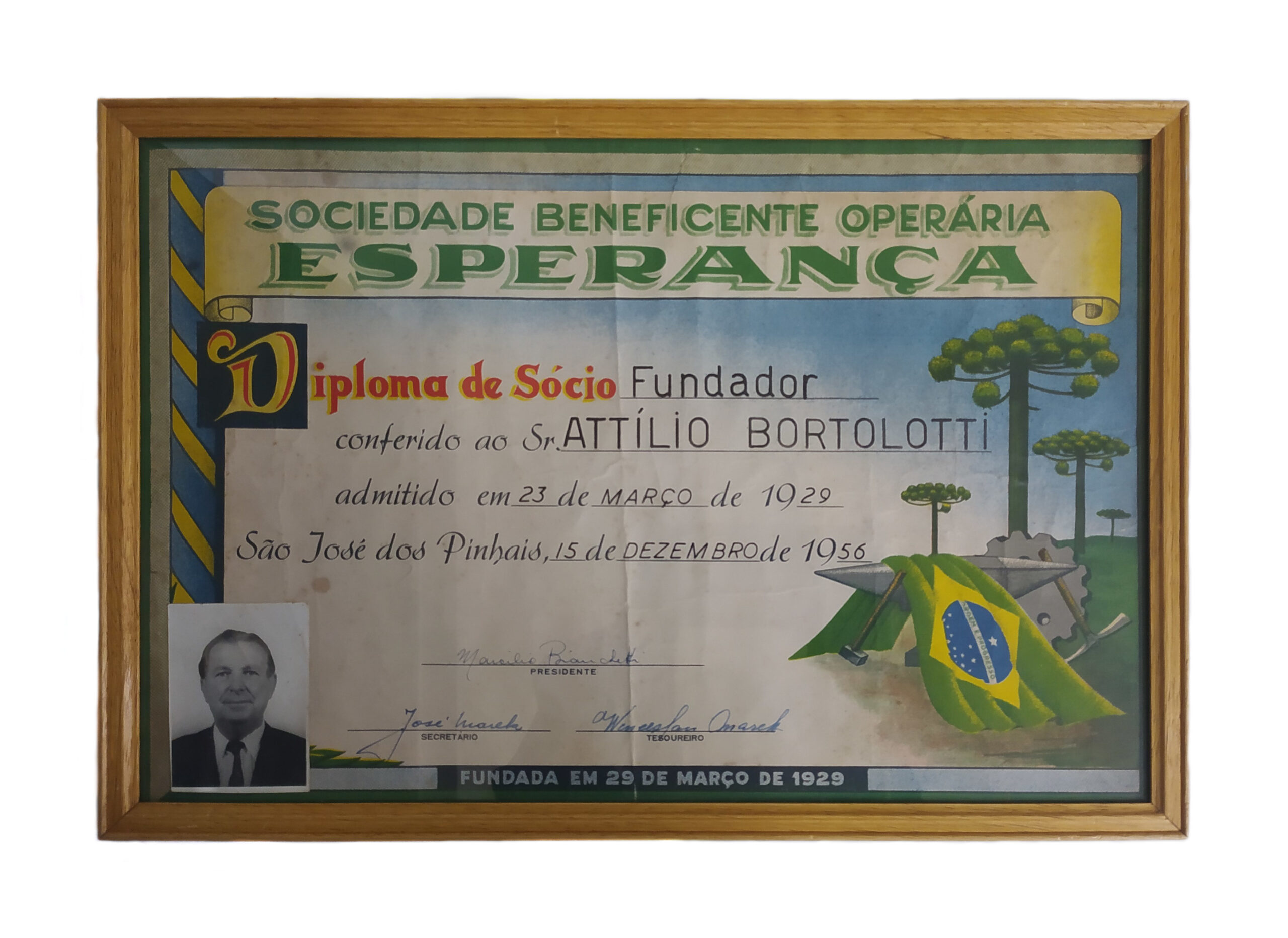 Diploma de Attilío Bortolotti emoldurado Voltar 25 de agosto de 2023 by Museu Municipal Atílio Rocco Documento Baixar Anexos Altura da moldura Detalhes da moldura Verso da moldura Miniatura Compartilhe TítuloDiploma de Attilío Bortolotti emolduradoDescriçãoDiploma de sócio fundador de Attilío Bortolotti emoldurado. Oferecido a ele pela Sociedade Beneficente Operária Esperança fundada em 29 de Março de 1929.Data15/12/1956LocalSão José dos PinhaisDimensões da moldura40,5 x 28 x 1,2 cmCategoriaEsculturaCromiaColoridaMolduraMoldura de madeira em formato retangular na cor marrom.Modo de incorporaçãoDoaçãoDoador | Vendedor:Famíla Attílio BortolottiData de aquisição | Doação20/08/1993 Continuar navegando Diploma de Atílio João Bortolotti emoldurado Diploma de Maria Eliza Machado Poplade emoldurado Voltar para a lista de itens