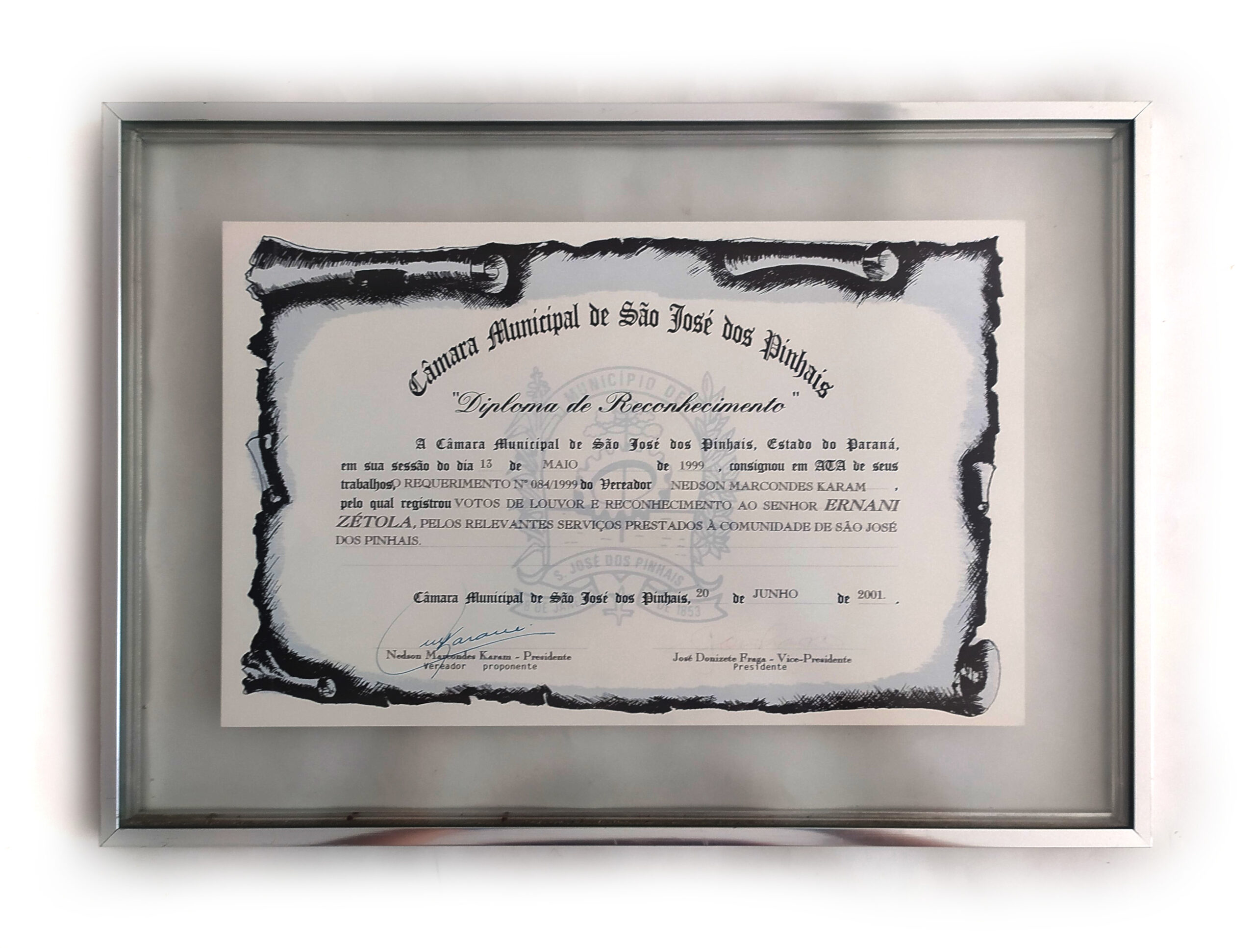 Diploma de Reconhecimento de Ernani Zétola Voltar 14 de setembro de 2023 by Museu Municipal Atílio Rocco Documento Baixar Anexos Altura da moldura Verso da moldura Miniatura Compartilhe TítuloDiploma de Reconhecimento de Ernani ZétolaDescriçãoDiploma de Reconhecimento à Ernani Zétola concedido pela Câmara Municipal de São José dos Pinhais por serviços prestados à sociedade são-joseense, assinado pelo vereador Nedson Mareondes Karam na sessão do 15 de Maio de 1999.Data20/06/2001LocalSão José dos PinhaisDimensões da moldura42 x 31 x 1,8 cmCategoriaEstampaCromiaColoridaMolduraMoldura de metal em formato retângular na cor cinza, possui vidro.Modo de incorporaçãoDoação Continuar navegando Diploma de Victor Bento emoldurado Diploma de Reconhecimento do colégio Colorido Voltar para a lista de itens