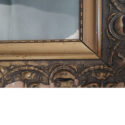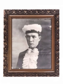 Fotografia em preto e branco de Flávio Zétola, ele está usando um uniforme aparentemente de colégio. Possui moldura de madeira trabalhada, com detalhes em relevo na cor dourada. Contém alguns rasgos nas pontas da fotografia, possui vidro de proteção.