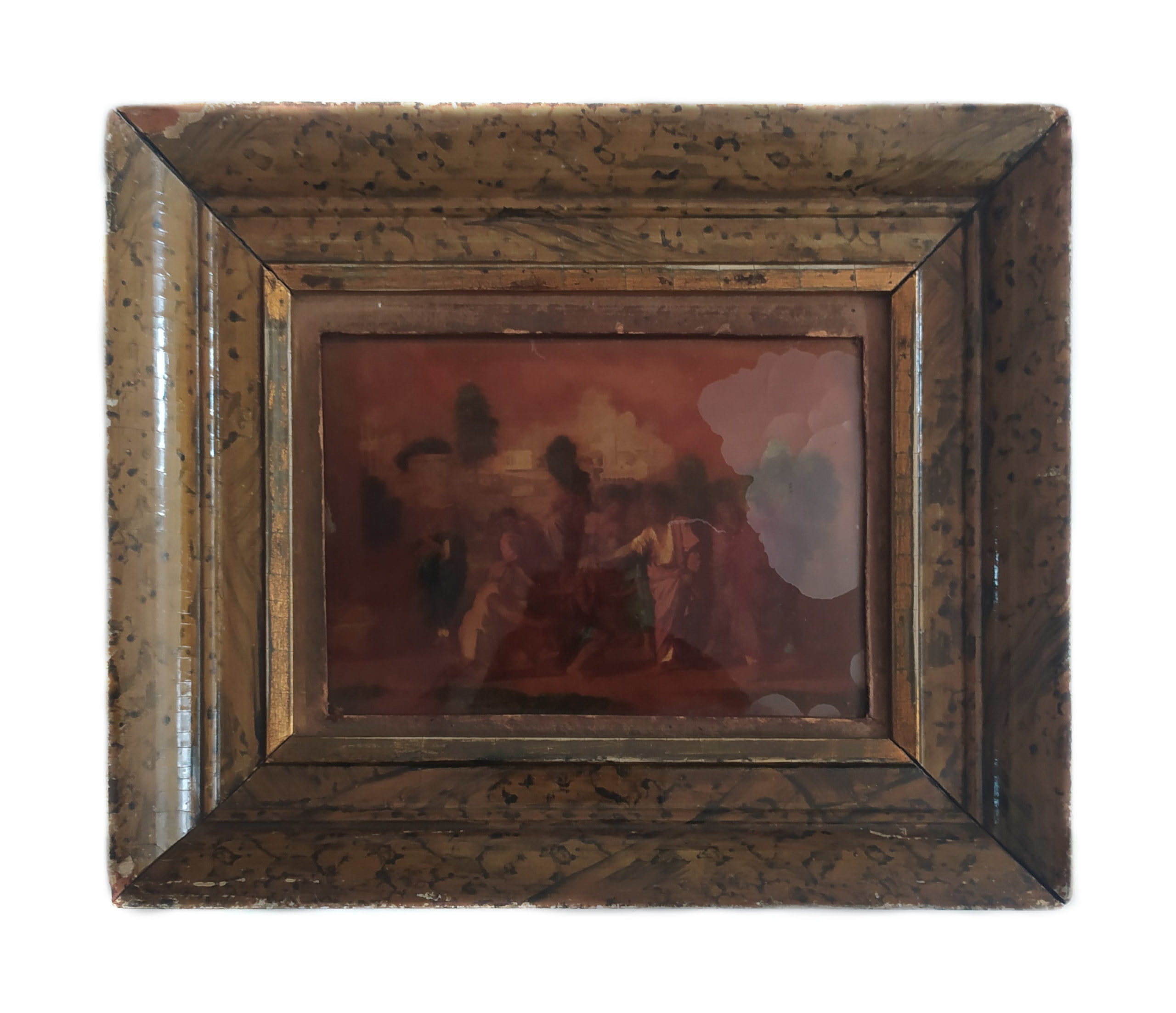 Moldura em alto relevo de madeira na cor marrom com manchas pretas e formato retangular. Contém imagem que parece ser uma pintura impressa de temática cristã. Imagem esta bastante deteriorada e verso da moldura está riscado à caneta com vários nomes, dentre eles Jorge, Isabel, Ana e João. E ainda possuiu ao verso junto aos nomes "Curitiba - Est: do Paraná" e "Oferecido em 5 de Junho de 1920".