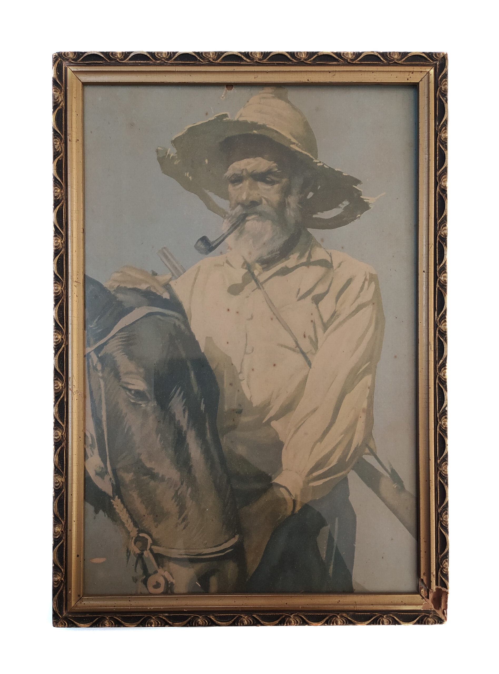 Pintura colorida e emoldurada de Serafim Teixeira Machado, mateiro que ajudou os engenheiros na construção da Usina de Chaminé, através do seu profundo conhecimento geográfico da região. A moldura é de madeira em formato retangular com borda interior em dourado e restante na cor preta, possui detalhes em alto relevo. Ao verso da moldura contém uma mensagem.