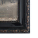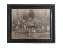 Fotografia das bodas de ouro de José Zaniolo e Ema Berton Zaniolo. Estão presentes também os familiares do casal, sendo a fotografia tomada na frente da igreja matriz, no dia 16/04/1944. Acompanha moldura retangular em madeira trabalhada, com vidro.