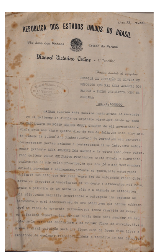 Exemplo disso, é o documento datado de 24 de julho de 1926, escriturado pelo tabelião Manoel Victorino Ordine, de uma escritura pública de quitação de depósito que fez Anna Auleckz a Pedro Chiuratto, Nessa escritura Anna afirma que depositou com Pedro a importância de um conto e setecentos mil réis, mas que perdeu o comprovante. Pedro reconhece a veracidade do depósito e essa escritura é feita para substituir o documento perdido. Pedro Chiuratto era muito honesto, por isso recebeu a incumbência de representar o Banco, movimentando importâncias em seu nome.
