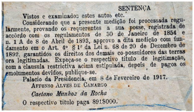 Diário Oficial de 19/02/1917, sentença reconhecendo a posse. Documento da coleção do autor.