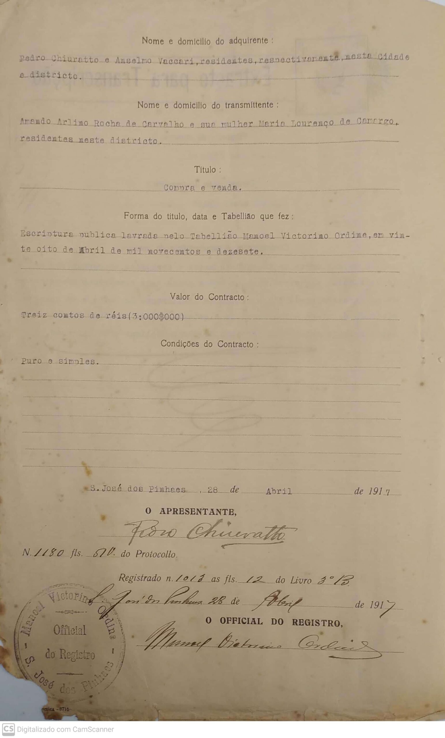 Compra e venda da área de 500 alqueires de Armando de Carvalho e Esposa Voltar 26 de junho de 2023 by Museu Municipal Atílio Rocco Documento Baixar Miniatura Compartilhe DescriçãoCompra e venda da área de 500 alqueires de Armando de Carvalho e Esposa por Pedro Chiuratto e Anselmo Vaccari.TítuloCompra e venda da área de 500 alqueires de Armando de Carvalho e EsposaData28/04/1917LocalSão José dos PinhaisModo de incorporaçãoDoaçãoDoador | VendedorManuel de Carlos AlmeidaTécnica, material e suportePapelIdiomaPortuguês Continuar navegando Escritura de compra e venda de área de Araçatuba de Cima Legitimação e Posse de Área de Araçatuba de Cima Voltar para a lista de itens