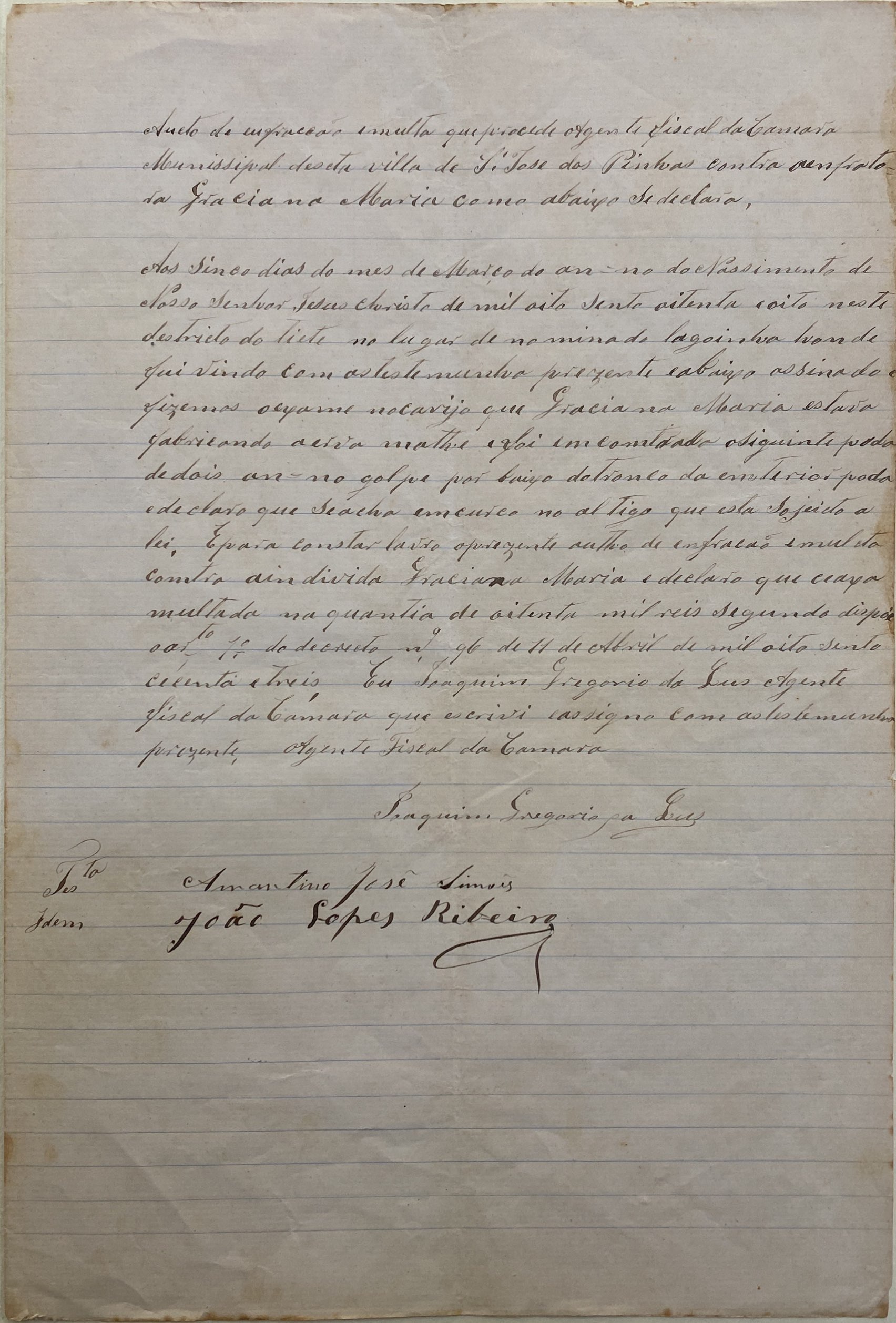 Aos cinco dias do mês de março do ano do NAscimento do Nosso Senhor Jesus Cristo de mil oitocentos e oitenta e oito neste distrito do Tietê no lugar denominado Lagoinha onde fui vindo com as testemunhas presentes e abaixo assinado o fizemos o exame no carijo que Graciano Maria foi encontrado o seguinte: poda de dois anos, golpe por baixo do tronco interior poda e declaro que se acha artigo que está sujeito a Lei. E para constar lavro o presente auto de infração e multa contra o indivíduo o Graciano Maria e declaro que se acha multado na quantia de oitocentos e sessenta e três. Eu Joaquim Gregorio da Luz, Agente Fiscal da Câmara que escrevi e assino com as testemunhas presentes.