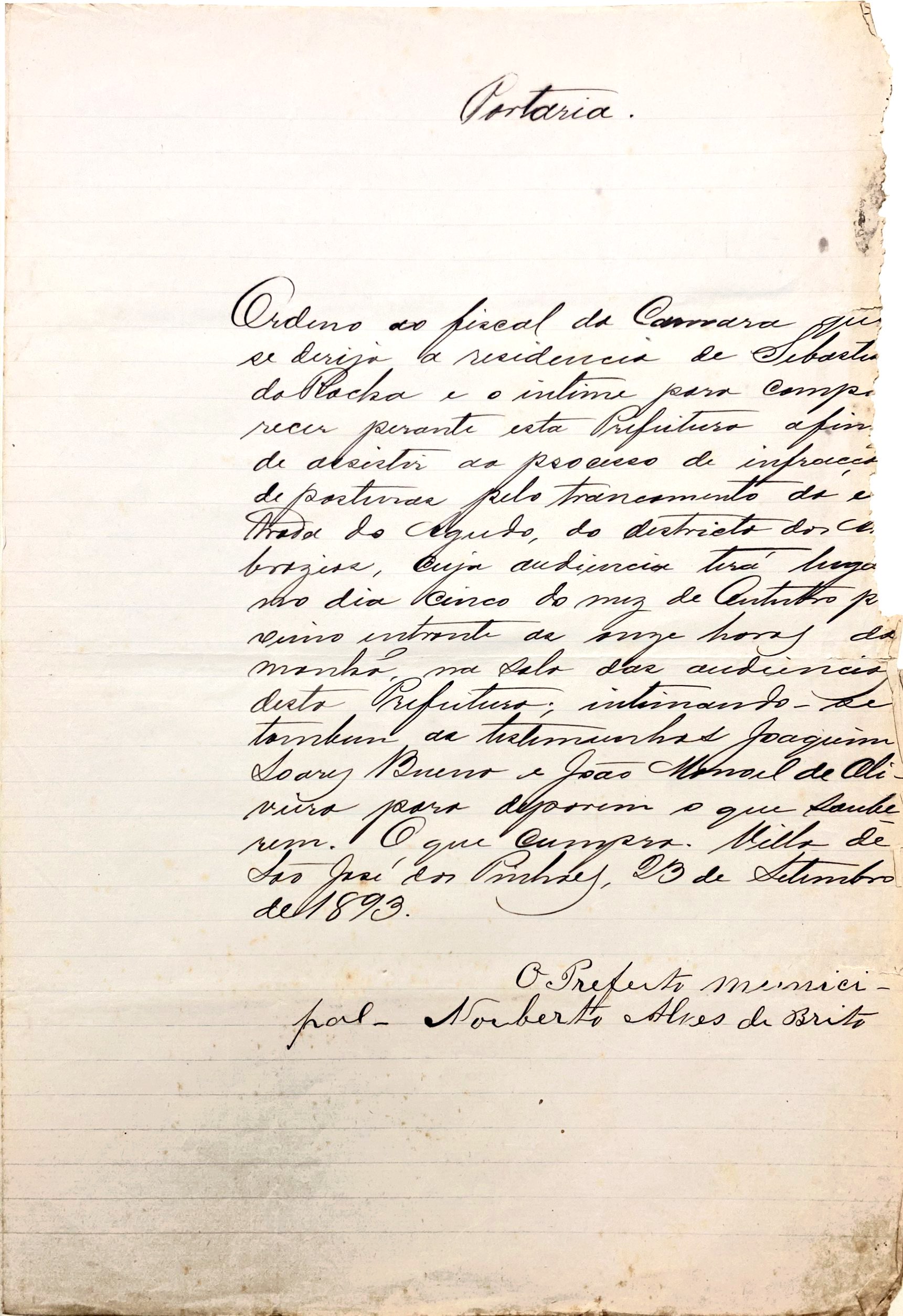 Ordeno ao fiscal da Comarca que se dirija a residência de Sebastião da Rocha e o intime para comparecer perante esta Prefeitura a fim de assistir ao processo de infração de posturas pelo trancamento da estrada do Agudo, do distrito dos Ambrózios, cuja audiência terá lugar no dia cinco do mês de Outubro próximo entrante às onze horas da manhã na sala das audiências desta Prefeitura; intimando-se também da testemunhas Joaquim Soares Bueno e João Manoel de Oliveira para deporem o que souberem. O que cumpra.