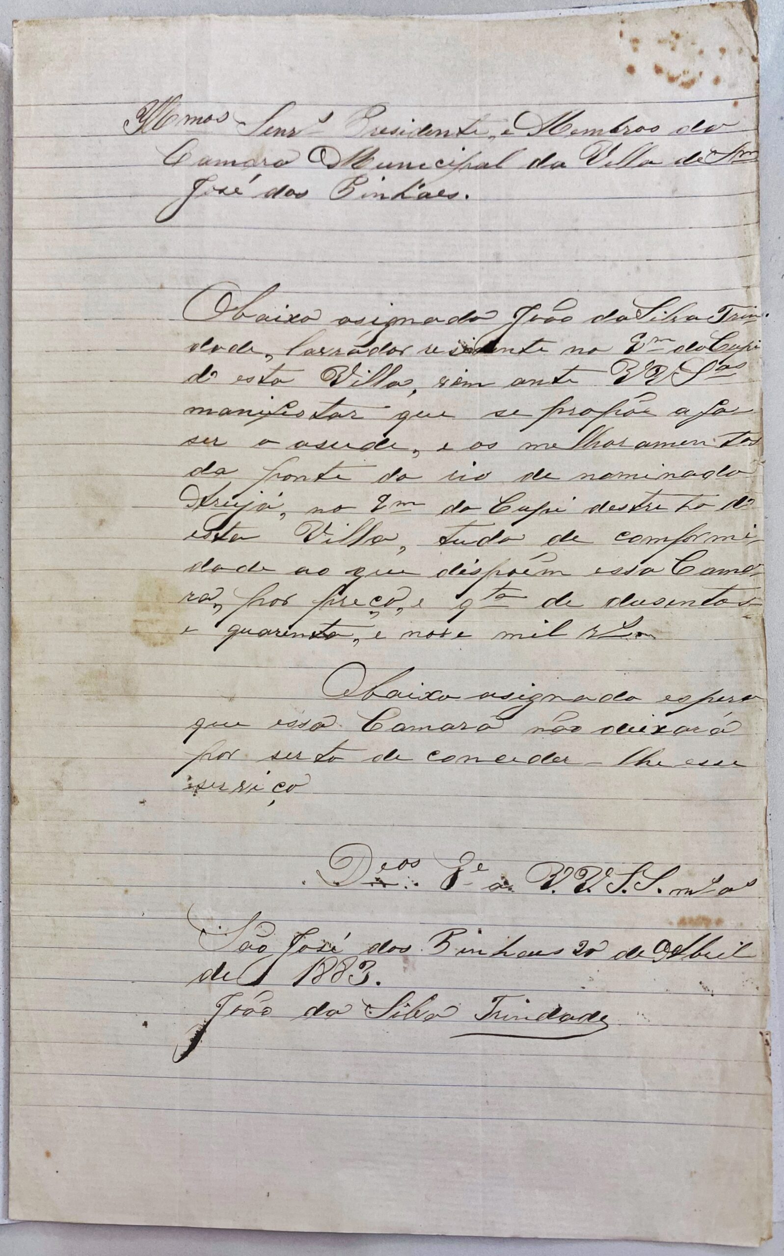 O abaixo assignado João da Silva Trindade, lavrador, residente, na estrada do Cupi, desta Villa, vem ante V.Sªs manifestar que se propõe a fazer o açude e os melhoramentos da ponte do rio denominado Arujá, no quarteirão do Cupi, distrito desta Villa, tudo de conformidade ao que dispõe essa Câmara, por preço e quantia de duzentos e quarenta e nove mil réis. Abaixo assignado espera que essa Câmara não deixará por certo de conceder-lhe seu serviço.