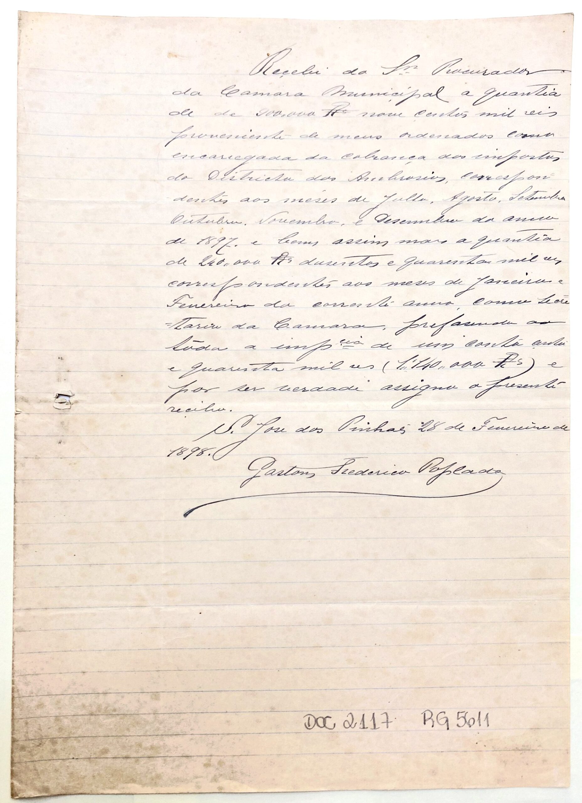 Recebi do Sr. Procurador da Câmara Municipal a quantia de 900:00 nove centos mil réis proveniente de meus ordenados como encarregado da cobrança dos impostos do Districto dos Ambrósios, correspondentes aos meses de Julho, Agosto, Setembro, Outubro, Novembro e Dezembro do anno de 1897 e bem assim mais a quantia de 240:00 duzentos e quarenta mil réis correspondentes aos meses de Janeiro de Fevereiro do corrente anno, como secretário da Câmara, perfazendo ao todo a imp.cia de um conto cento e quarenta mil reis (1:140:000$) e por ser verdade de assigno o presente recibo.