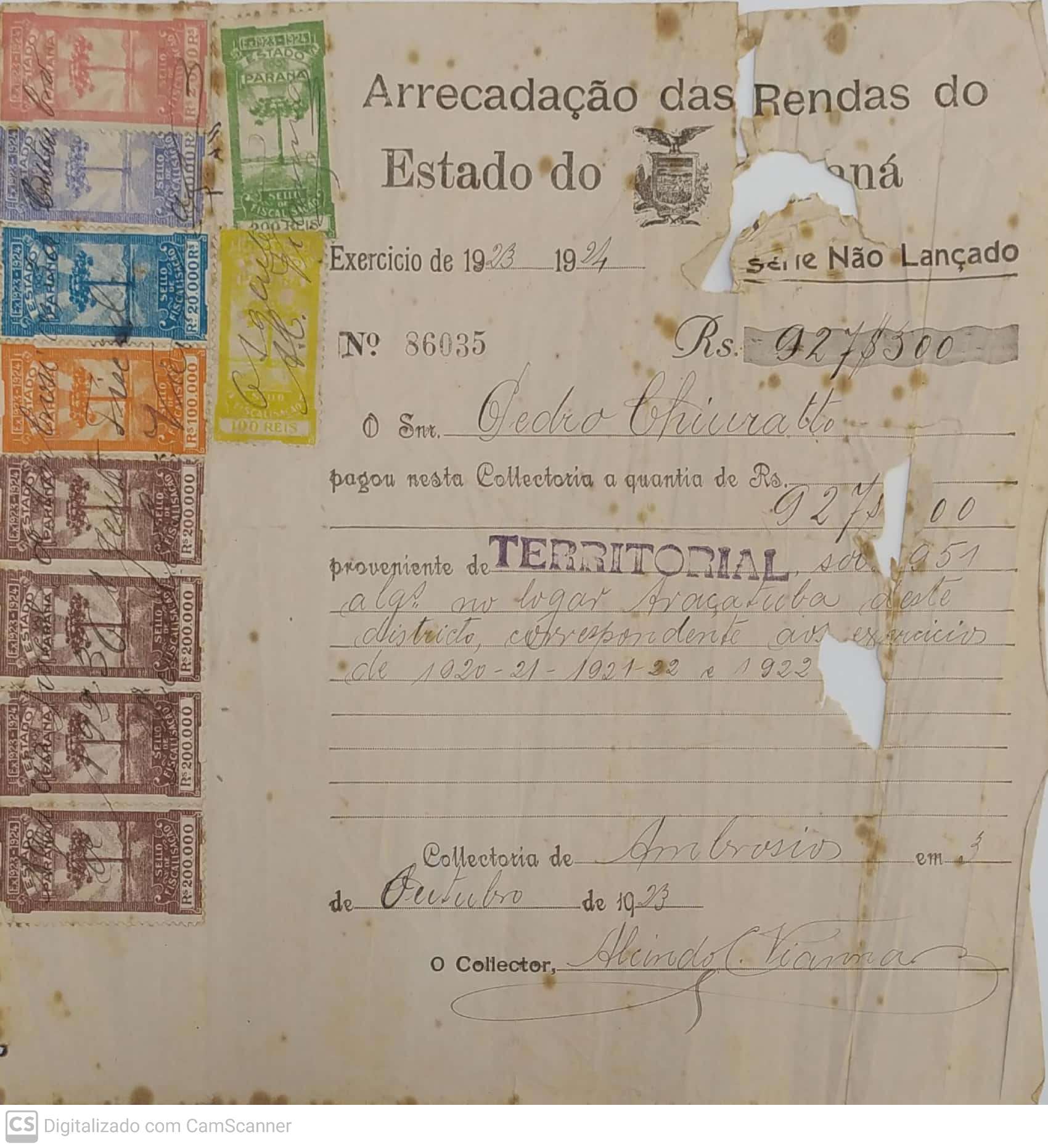 Recibos de pagamento aos impostos territoriais da área de Araçatuba de Cima Voltar 27 de junho de 2023 by Museu Municipal Atílio Rocco Documento Baixar Miniatura Compartilhe DescriçãoDoze recibos de pagamento aos impostos territoriais da área de Araçatuba de Cima pagos por Pedro Chiuratto.TítuloRecibos de pagamento aos impostos territoriais da área de Araçatuba de CimaData1926 - 1927LocalSão José dos PinhaisModo de incorporaçãoDoaçãoDoador | VendedorManuel de Carlos AlmeidaTécnica, material e suportePapelIdiomaPortuguês Continuar navegando Carta de João Paulino Machado Aprovação de medidas da área de Araçatuba de cima Voltar para a lista de itens