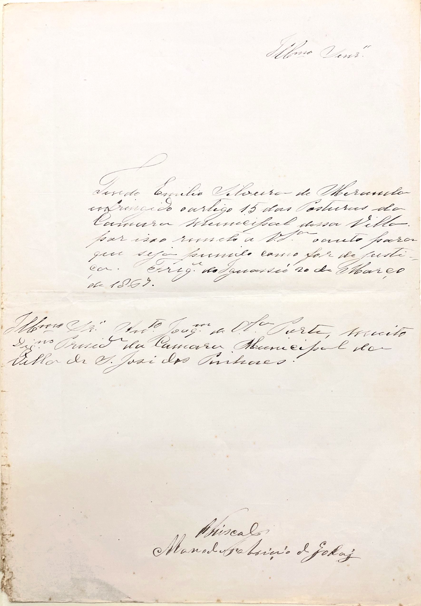 Tendo Emílio Silveira de Miranda infringido o artigo 15 das Posturas das Câmara Municipal desta Villa, por isso remeto a V. Sª. o auto para que seja punido como for de justiça.