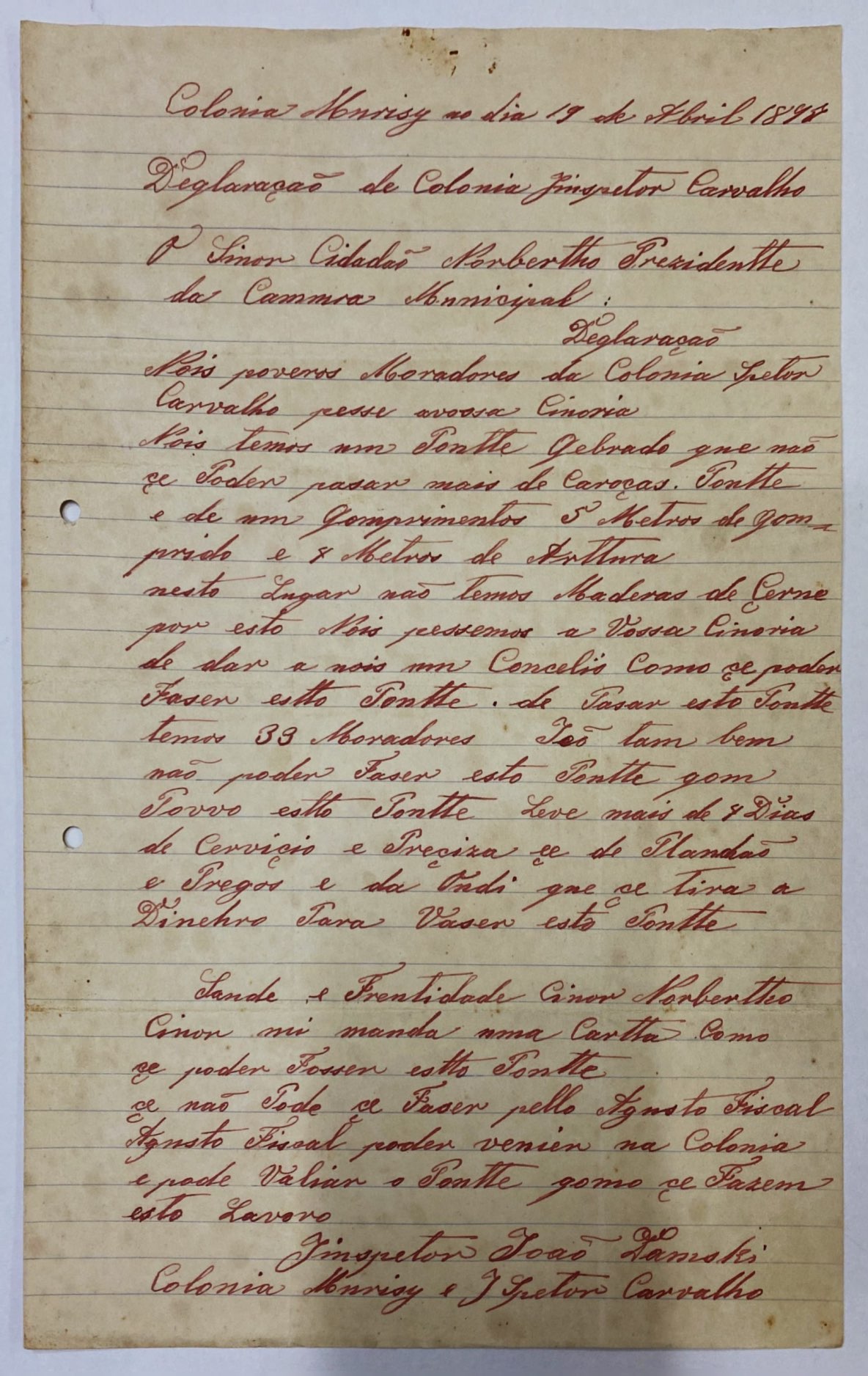 Nós, pobres moradores da Colônia Inspetor Carvalho pedimos a Vossa Senhoria.
