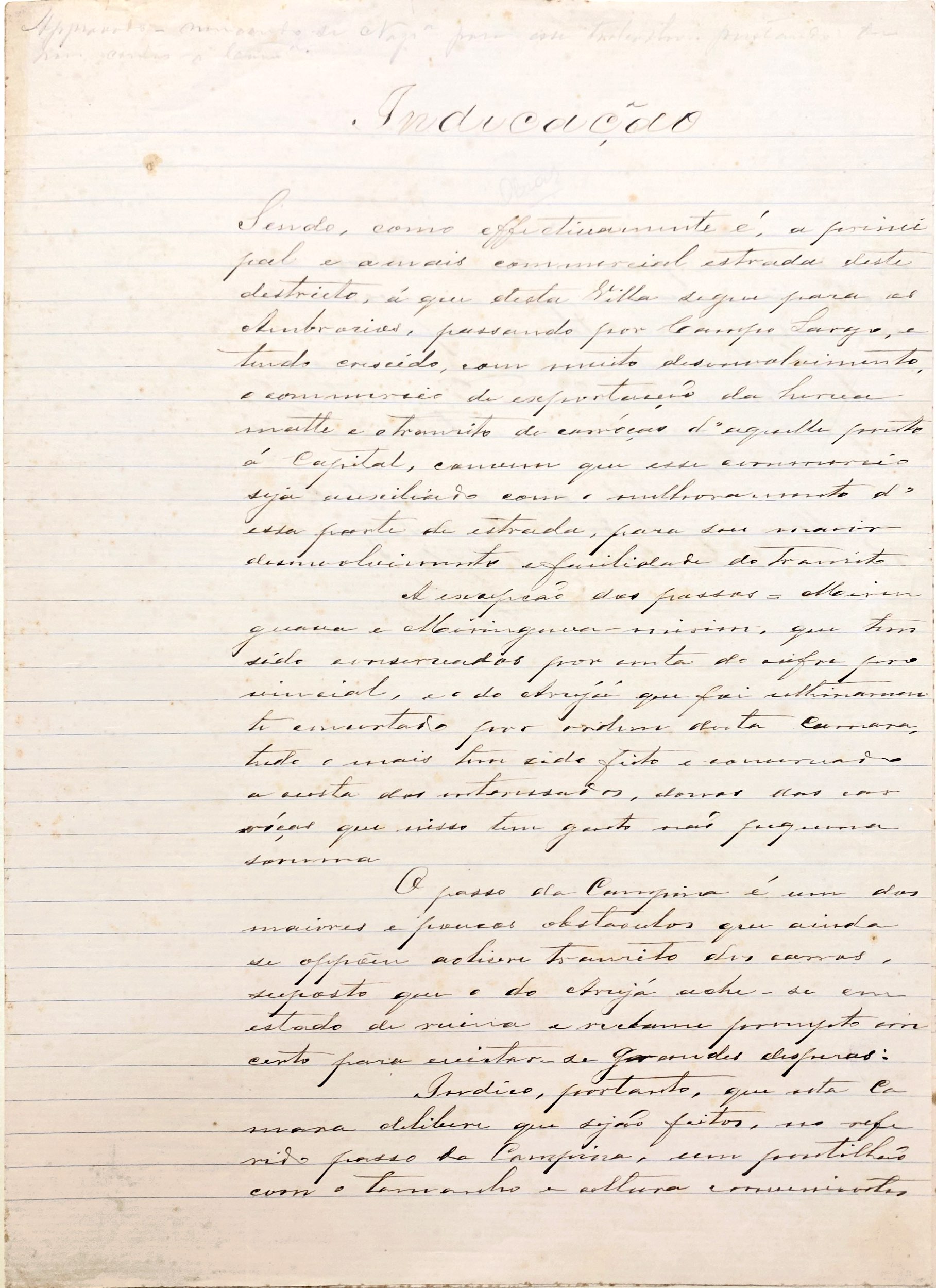 Indica, portanto, que esta Câmara delibere que sejam feitos no referido passo da Campina um pontilhão com o tamanho e altura convenientes açudando-se para ambos os lados, na distância necessária para nivelar os morros e consertar-se o passo do Arujá fazendo-se esses serviços por arrematação ou administração conforme a Câmara entender mais conveniente.