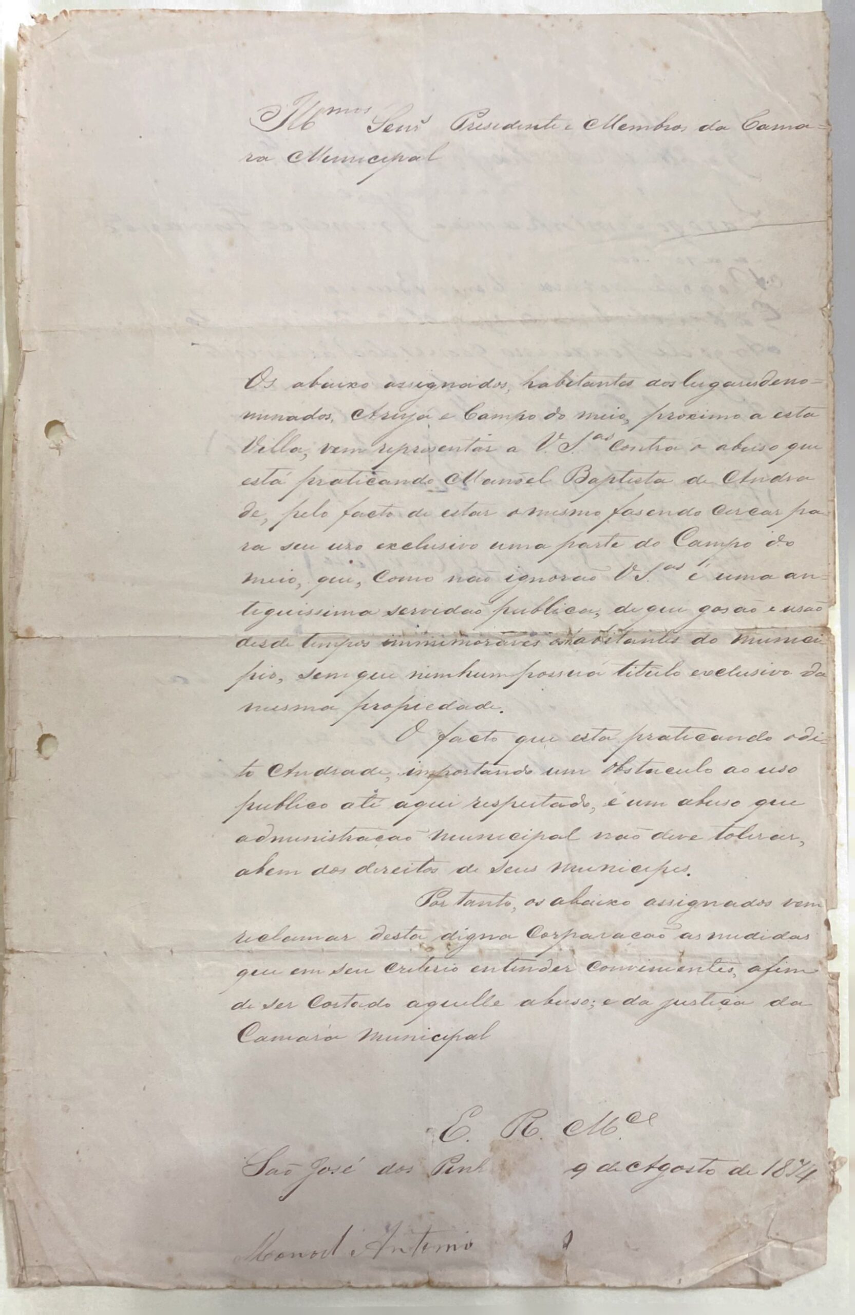 Os abaixo assinados , habitantes dos lugares denominados Arujá e Campo do Meio, próximo a esta Vila, vem representar a V.Sªs. contra o abuso que está praticando Manoel Baptista de Andrade, pelo fato de estar o mesmo fazendo cercas para seu uso exclusivo, uma parte do Campo do Meio que como não ignoram V. Sªs é uma antiguíssima servidão pública, de que gosam e usam desde tempos memoráveis os habitantes do município, sem que nenhum possuía título da mesma propriedade.