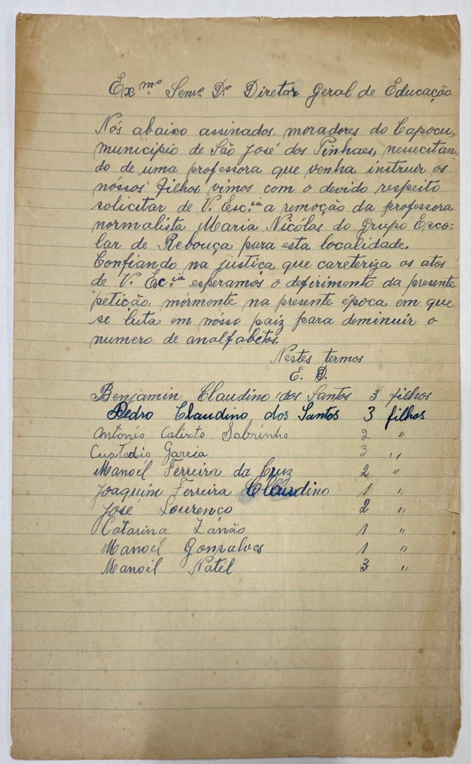 Nos abaixo assinados, moradores do Capocu, Município de São José dos Pinhais, necessitando de uma professora que venha instruir os nossos filhos, vimos com o devido respeito, solicitar de V. Exª. a remoção da professora normalista Maria Nicolas do Grupo Escolar de Rebouça para essa localidade.