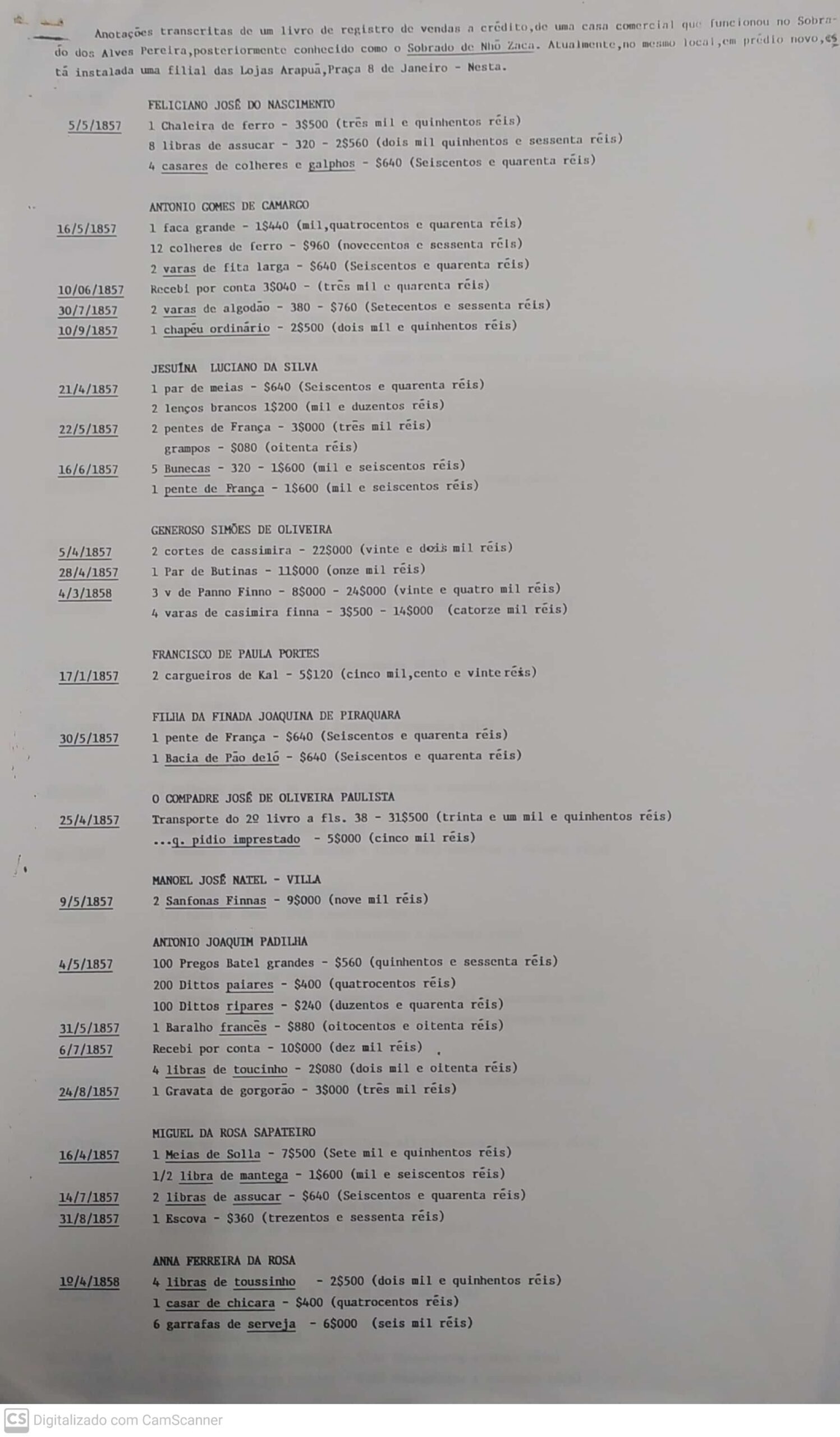 Transcrição do Livro de Vendas Voltar 23 de junho de 2023 by Museu Municipal Atílio Rocco Documento Baixar Miniatura Compartilhe DescriçãoTranscrições de um livro de registro de vendas a credito de uma casa comercial que funcionou sobrado dos Alves Pereira.TítuloTranscrição do Livro de VendasLocalSão José dos PinhaisModo de incorporaçãoDoaçãoDoador | VendedorMaria Angélica MarochiTécnica, material e suportePapelIdiomaPortuguês Continuar navegando Fragentos Históricos Carteira de trabalho de Ernani Zetola Voltar para a lista de itens