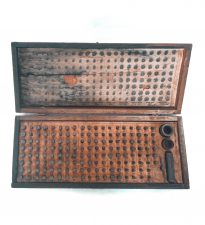 Caixa de madeira, medindo 18 x 43,5 cm, contendo 150(cento e cinquenta) dentes de ferro ou aço, usados como moldes no serviço de prótese dentária. A caixa ainda contém dois anéis, um cilindro e uma pequena chave, também do mesmo metal dos moldes de dentes. OBS.: A caixa deu entrada neste Museu bastante danificada.