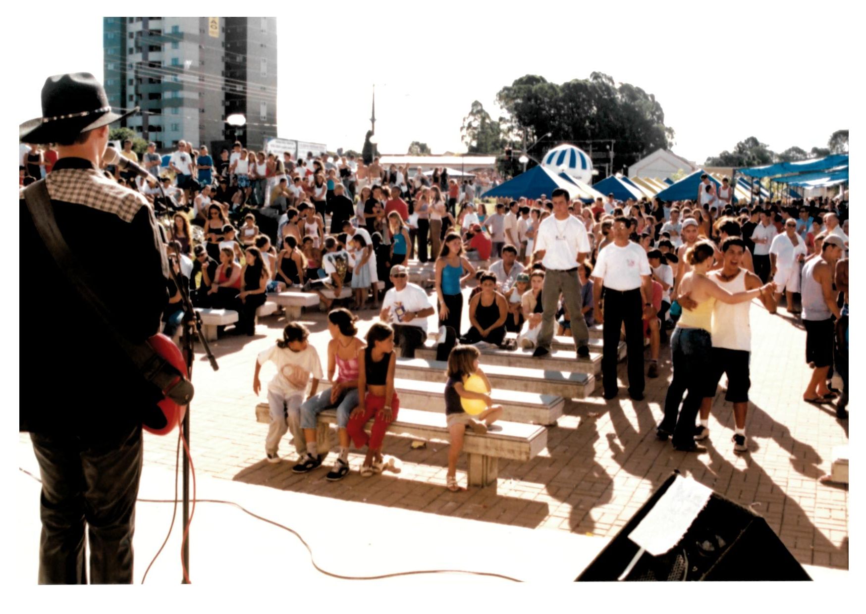 Apresentação de Músicos (aparentemente do estilo sertanejo), no evento da Praça do Verbo Divino. Descrição do verso da imagem: Domingo na Praça 03/02/2002 SICTUR
