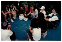 Crianças nas Férias Culturais, provavelmente acompanhadas de professoras ou voluntárias, aparentemente em atividade de aprendizado. Descrição da imagem: Férias Culturais do dia 28 ao dia 10 do 01 de 2000