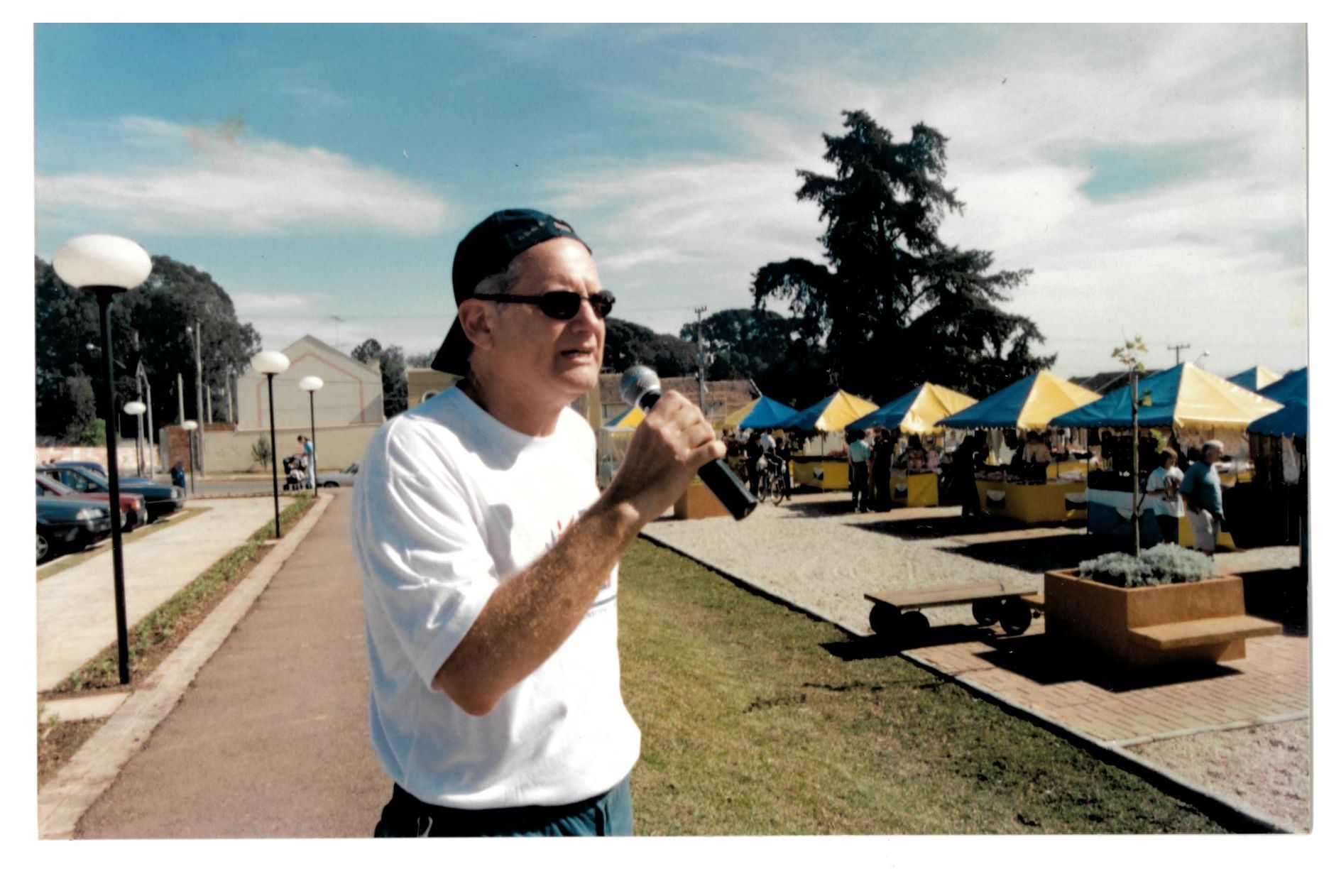 Palestra na Praça do Verbo Divino, palestrante não identificado. Descrição do verso da fotografia: Prefeitura de São José dos Pinhais Área da Comunicação Domingo na Praça 05/08/2001 Pça do Verbo Divino