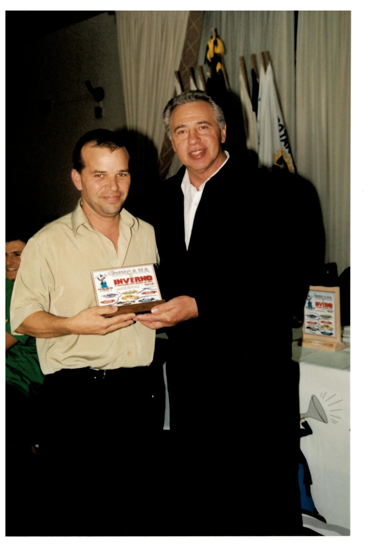 Luiz Carlos Setim premiando pessoa não identificada, com placa comemorativa da 4º Gincana de Inverno em São José dos Pinhais. Descrição do verso da imagem: esporte e lazer gincana de inverno