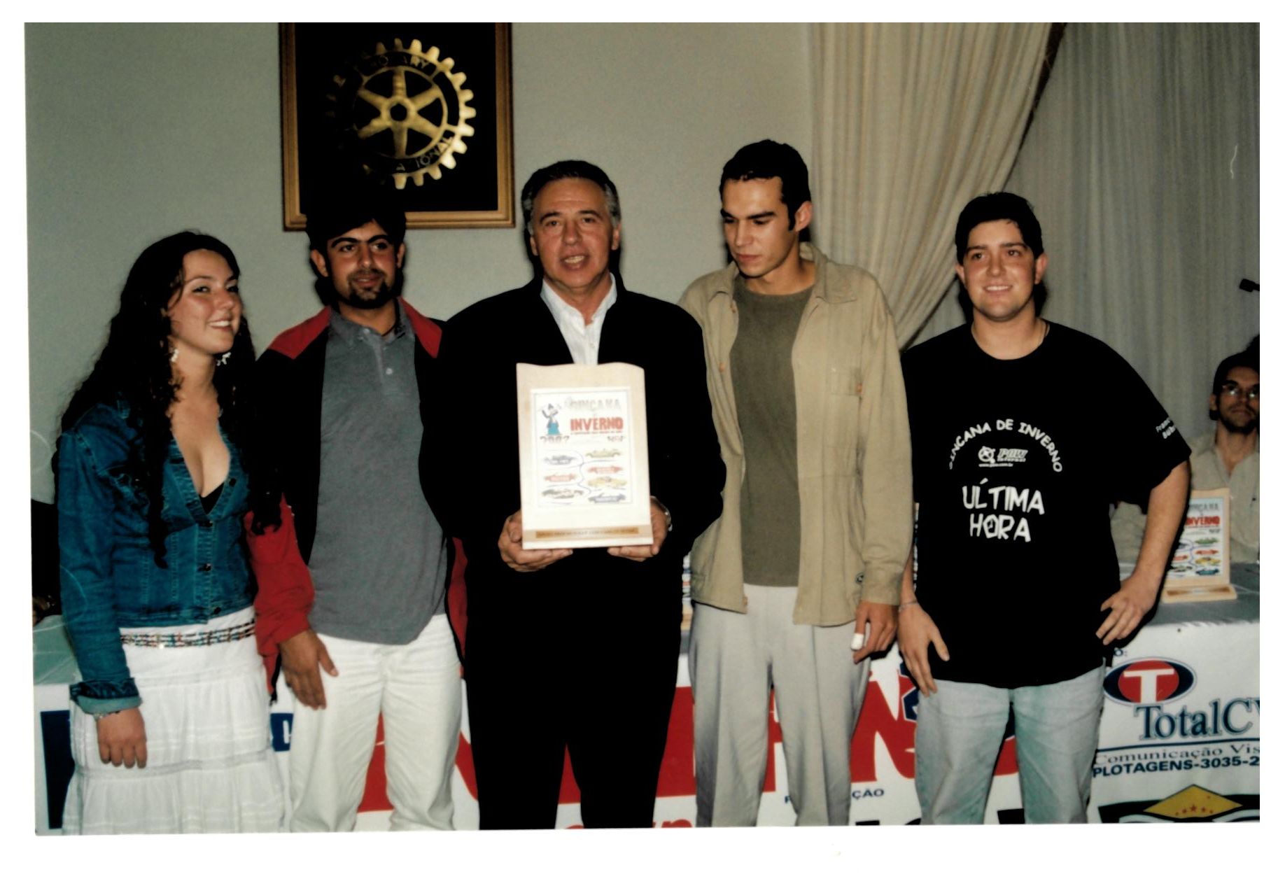Luiz Carlos Setim com premiação da 4º Gincana de inverno de São José dos Pinhais, demais pessoas não identificadas. Descrição do verso da foto: esporte lazer gincana de inverno