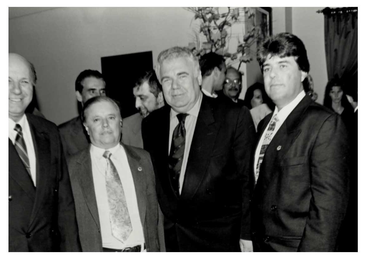 Fotografia de Jaime Lerner e João Batista Ferreira da Cruz em evento, demais pessoas sem identificação. Descrição do verso da imagem: Prefeitura Municipal de São José dos Pinhais Secretaria de Articulação com a Comunidade, Assunto Implantação do Distrito Industrial (São José dos Pinhais). data: 18/03/96 local: Hotel fazenda Paraná- Golf