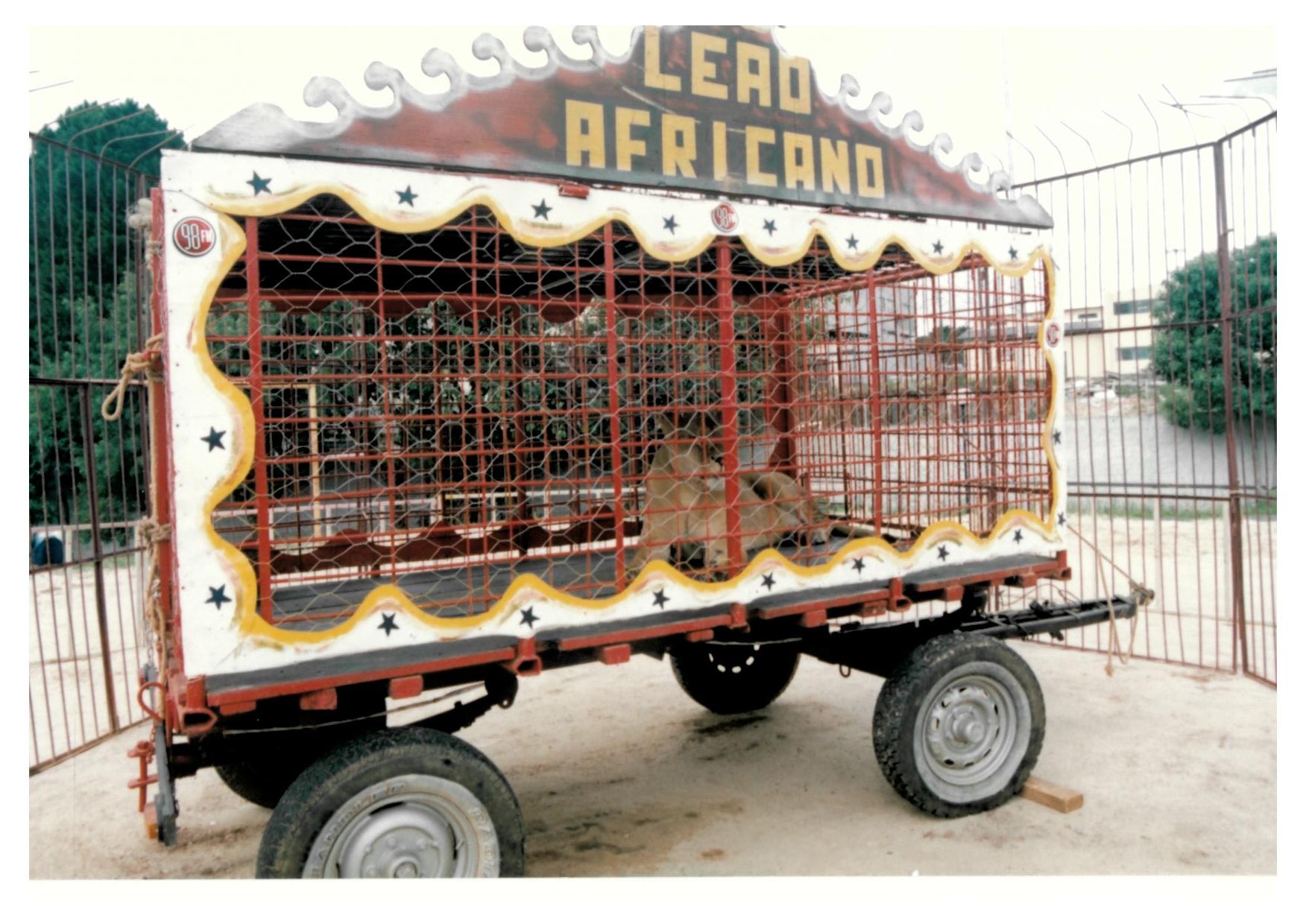 Fotografia de Leoa Africana em Jaula no ano de 2002, ainda era permitido o porte destes animais para shows. Descrição do verso da Imagem: Domingo na Praça 03/02 SICTUR