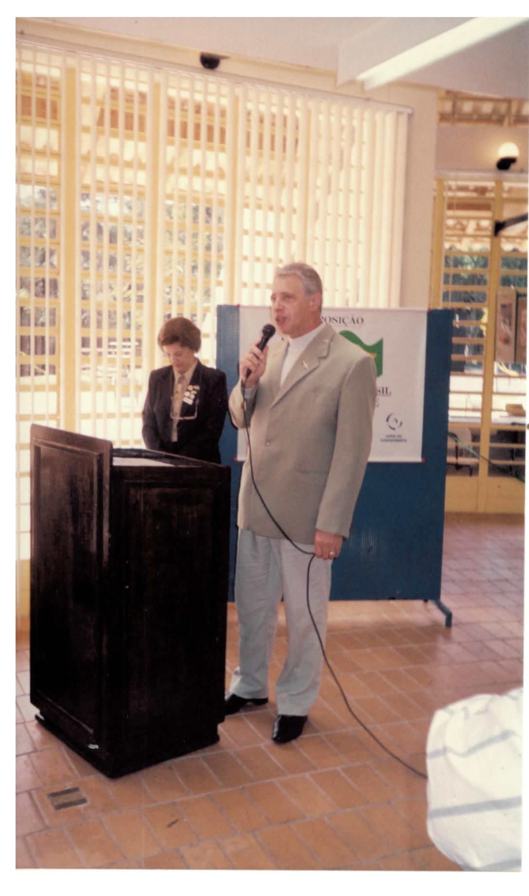 Luiz Carlos Setim palestrando em evento, demais pessoas não identificadas. Descrição da imagem: Abertura da exposição, A história do Brasil através da Arte, com a secretária da Promoção Social Iara Rocha data 20/04/00