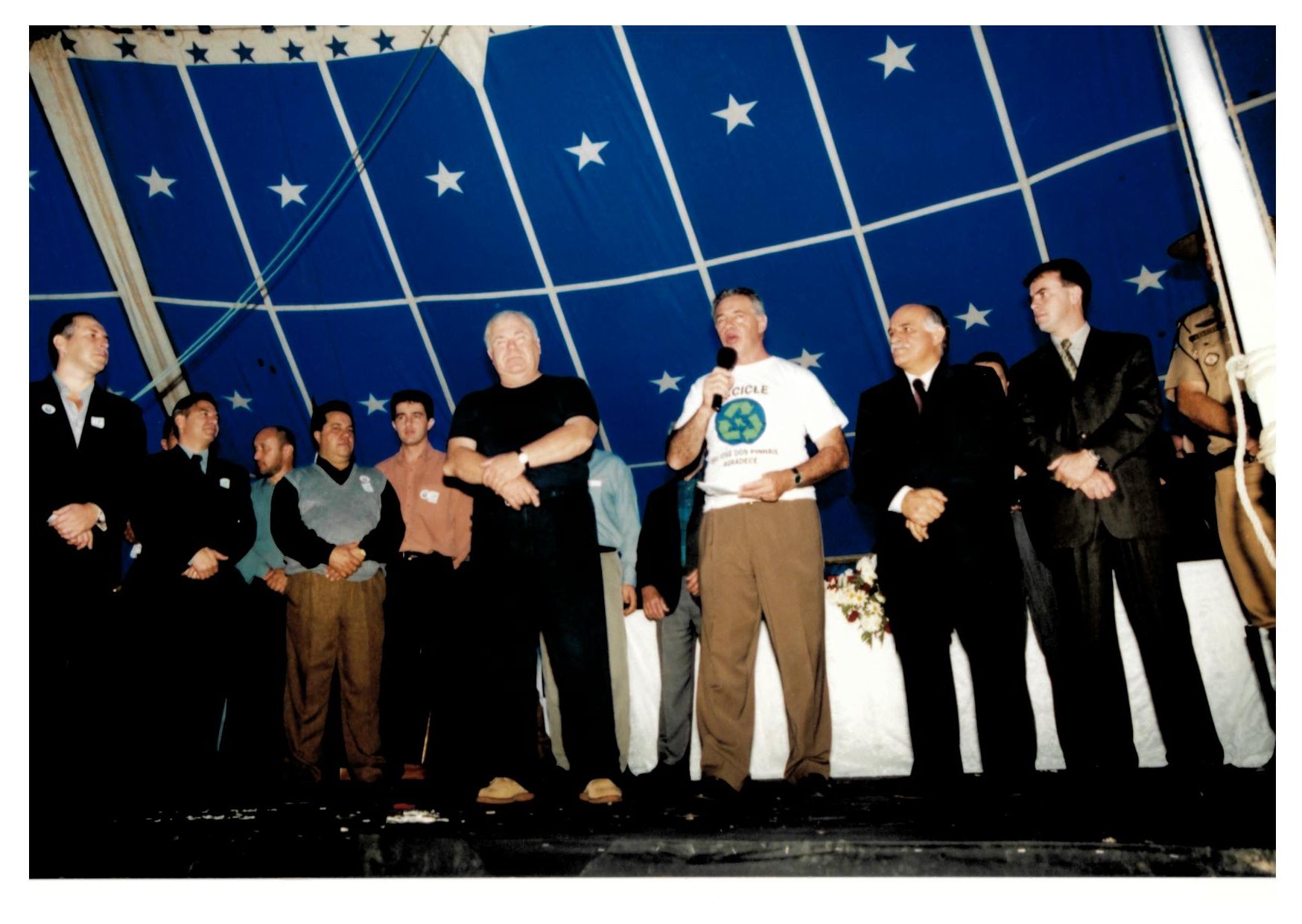 Luiz Carlos Setim e Jaime Lerner no dia mundial do meio ambiente, demais pessoas não identificadas, evento realizado em lona de circo no Parque Iguaçu. Descrição do verso da fotografia: Prefeitura de São José dos Pinhais, Dpto. De Comunicação - Imprensa, Secretaria Semuma