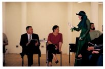 Luiz Carlos Setim assistindo representação teatral feita por atriz em reunião, demais pessoas não identificadas. Descrição da foto Representação de Cacos Poéticos na reunião da Assocult data 01/10/99