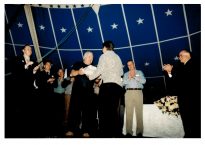 Jaime Lerner sendo presenteado no Dia Mundial do Meio Ambiente 05 de Junho, realizado em lona de circo no Parque Iguaçu, demais pessoas não identificadas. Descrição do verso da fotografia: Prefeitura de São José dos Pinhais Dpto. de Comunicação Social - Imprensa, Dia Mundial do Meio Ambiente, Secretaria: Semuma
