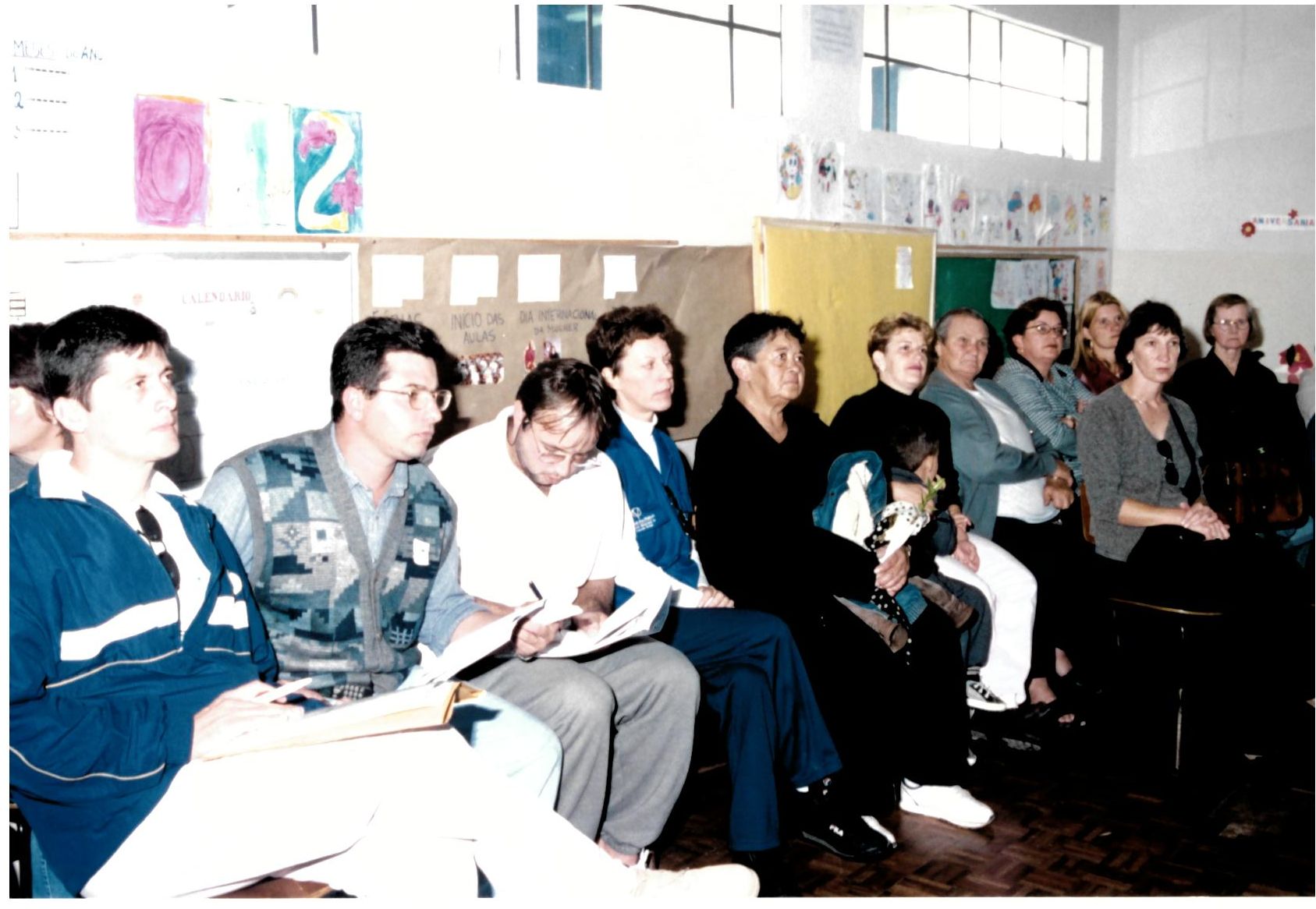Reunião em sala da aula. Descrição do verso da foto: Prefeitura de São José dos Pinhais Dpto. comunicação - Imprensa Prefeitura nos Bairros Jdim Maria Cecília I e II e Bairro Afonso Pena