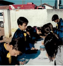 Crianças fazendo atividades de pintura. Descrição do verso da imagem: Prefeitura de São José dos Pinhais DPTO. comunicação - Imprensa Prefeitura nos Bairros Jdim Maria Cecília I e II Bairro Afonso Pena.