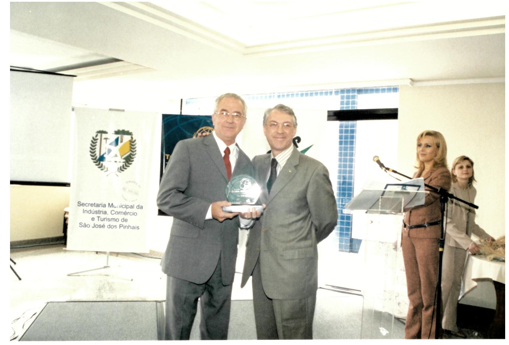 Evento de Premiação do Troféu Comercial, com Silvia Bonk ao fundo no Púlpito, demais pessoa não identificadas. Descrição do verso da imagem: Área da Comunicação Social Dia do Comerciário 15/07/2004 SICTUR