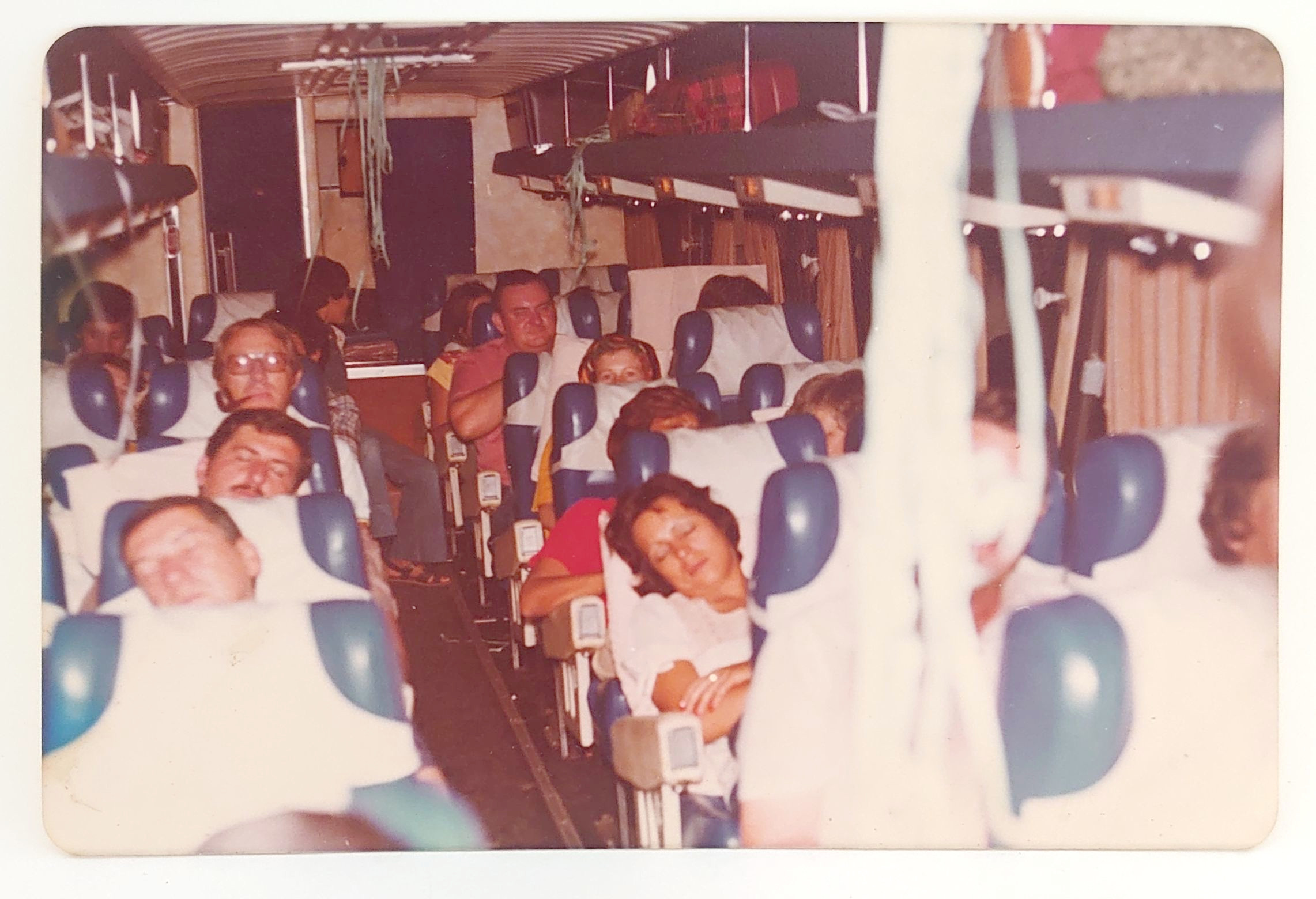 Excursionistas do Lions Clube São José dos Pinhais - Centro no interior do ônibus rumo à Assunção no Paraguai. Ernani Zetola é o primeiro no canto inferior esquerdo.