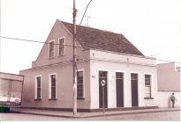 Casa de comércio e moradia - Rua XV de novembro, 1714. Edificação de esquina construída no alinhamento, em alvenaria com um pavimento e sótão. A construção de um lado apresenta três portas e uma janela e do outro três janelas. Há um pedestre próximo a janela. Data: 20/07/1977.