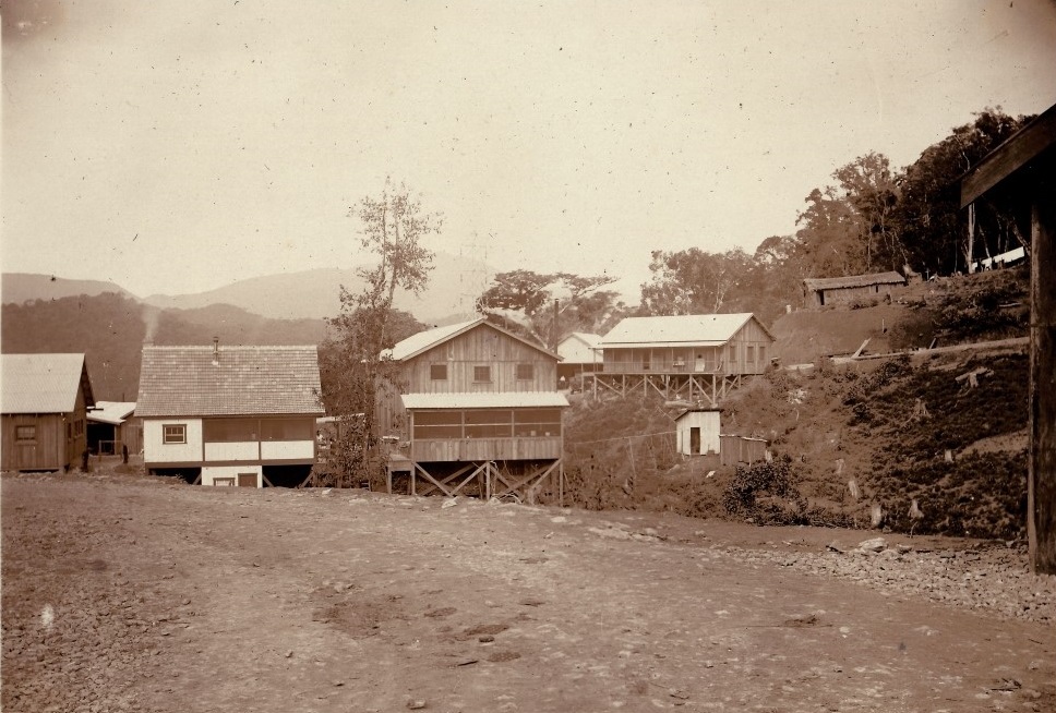 Na imagem se vê um conjunto de 4 casas de madeira, com uma quinta entrecoberta por uma arvore, o chão que guia até elas é de terra e ao fundo se veem montanhas e mata nativa