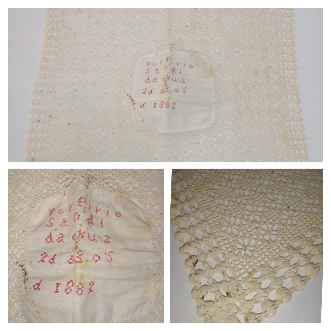 Toalha de crochê, tendo ao centro, pequena aplicação em tecido de algodão branco e sobre a mesma, minúsculos bordados com linha vermelha, em ponto de cruz, com os seguintes dizeres: "Porfírio Sandi da Cruz - 02 de agosto de 1882".