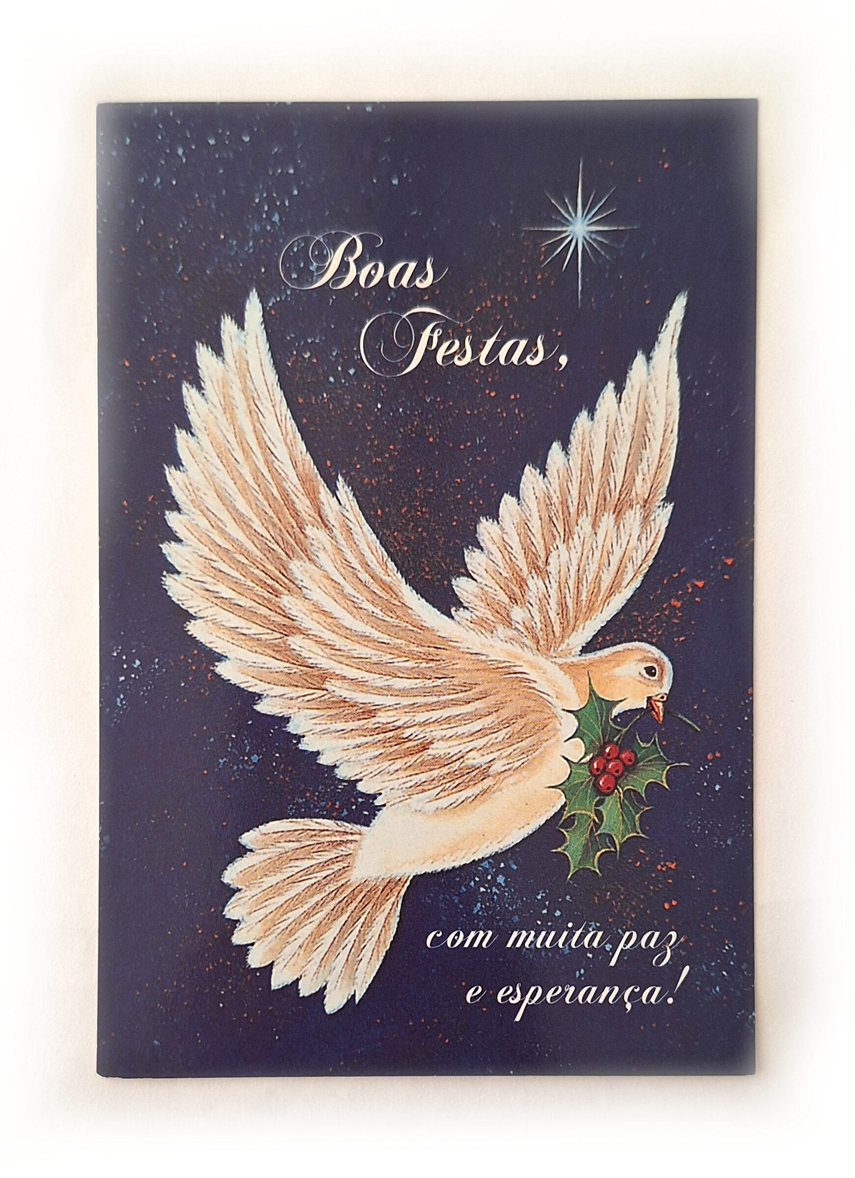 • Cartão de boas festas com fundo azul escuro e pomba do espírito santo na capa, recebido por Ernani Zetola.