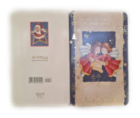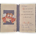 Cartão de boas festas com imagem de dois anjinhos cantando e segurando papiro com detalhes em dourado e frase natalina. No interior do cartão a mesma imagem da capa juntamente com mensagem escrita à caneta.