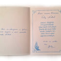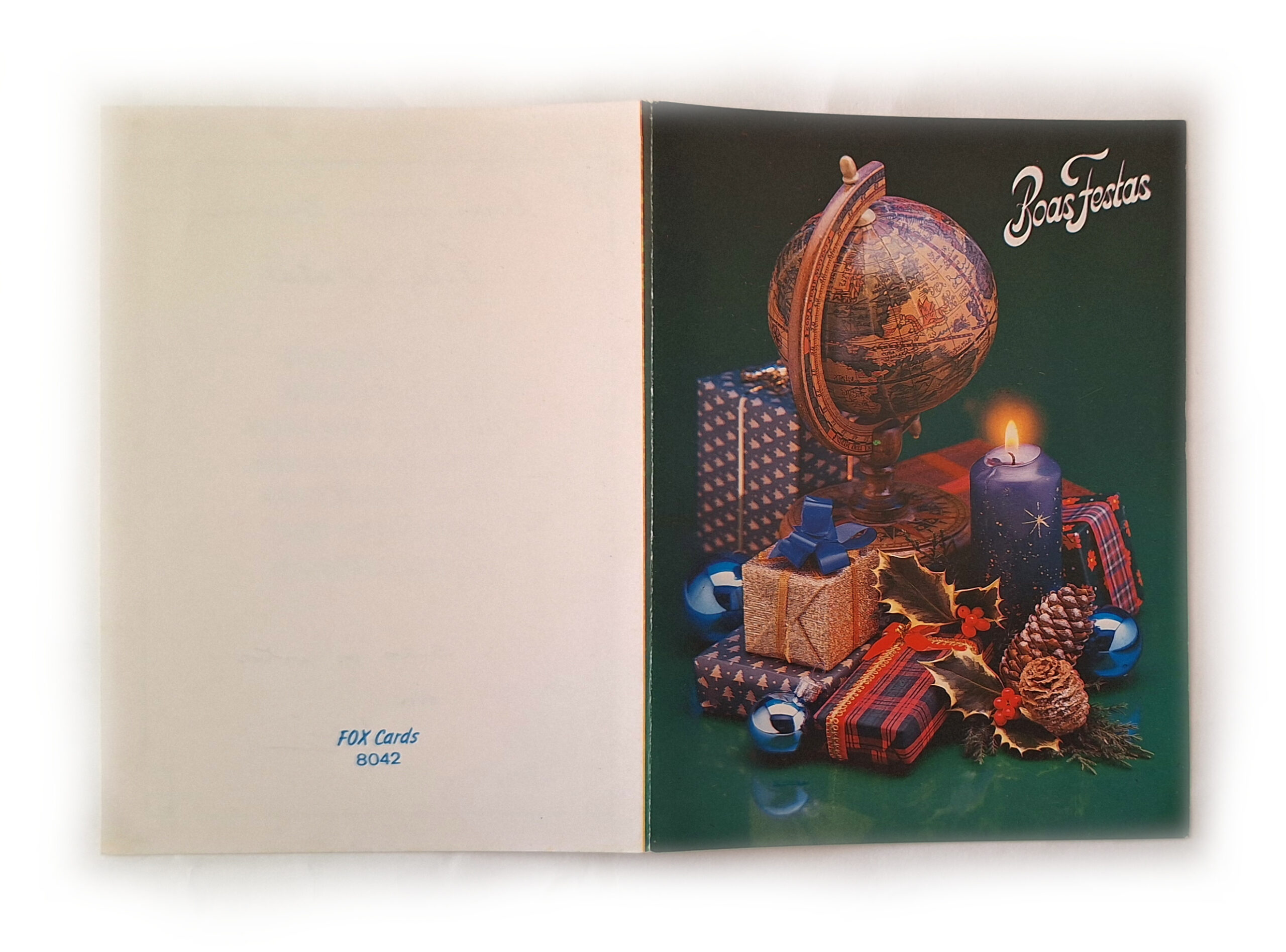 Cartão de boas festas. Na capa, imagem de presentes, velas e um globo terrestre. Fundo verde. No interior mensagem impressa e mensagem escrita a caneta.