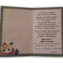 Cartão de Natal colorido em alto relevo com papai Noel e meias na capa. Interior decorado com mensagem de natal. No canto inferior do cartão mensagem à caneta.