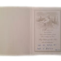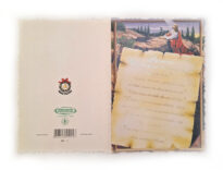 Cartão de natal com tema religioso. Na capa, a imagem de Jesus Cristo e em primeiro plano, a oração “Pai Nosso” em letras douradas. No interior do cartão, uma mensagem impressa que ressalta a importância da oração. Em seguida, uma mensagem escrita a caneta.