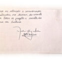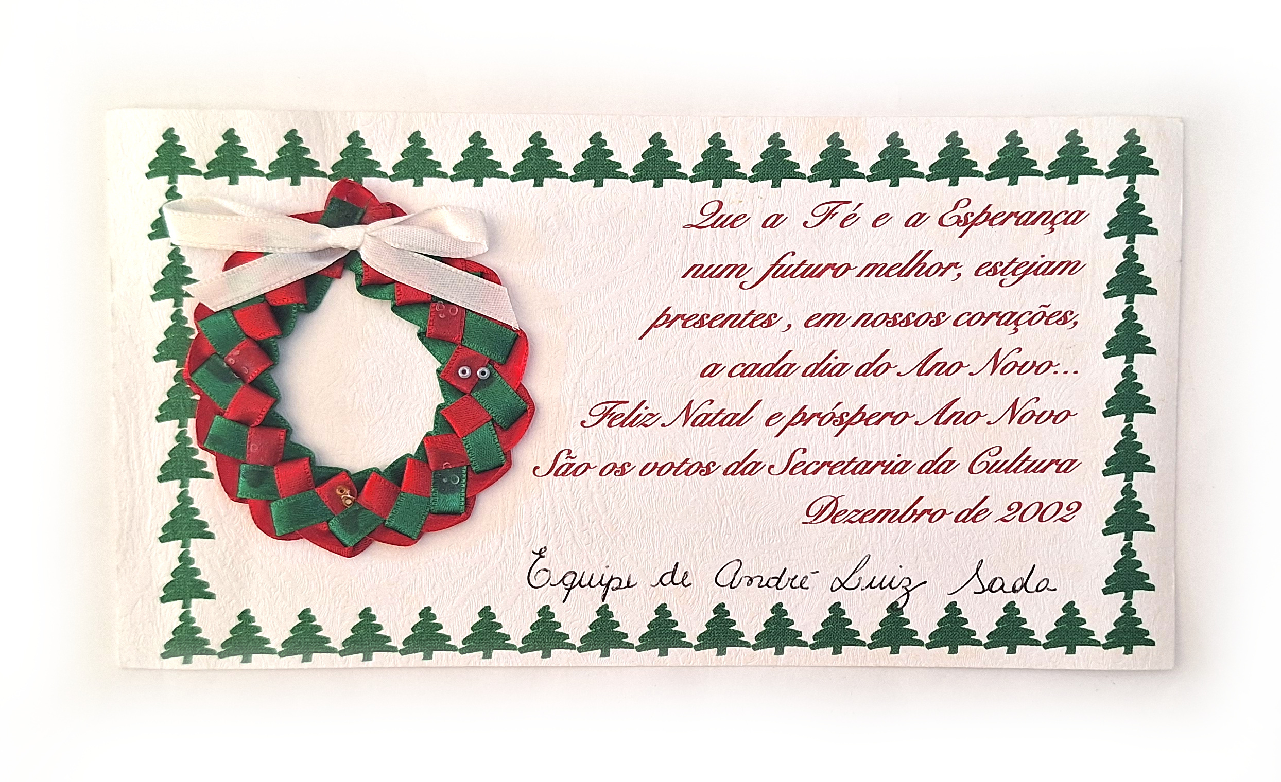 • Cartão de natal com uma folha retangular branca em alto relevo e possui uma borda de mini arvores de natal, recebido por Ernani Zetola.