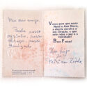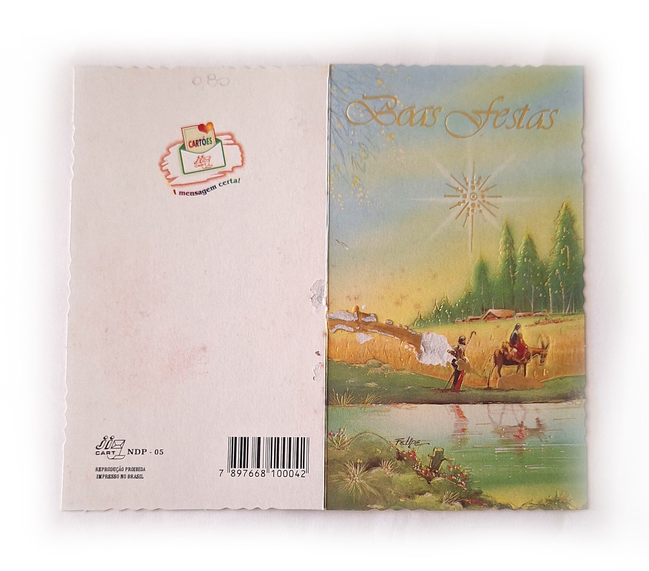 Cartão desejando boas festas com imagem da Santa Família e a Estrela de Belém. No interior, uma mensagem de boas festas. Contém mensagem escrita a caneta.