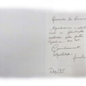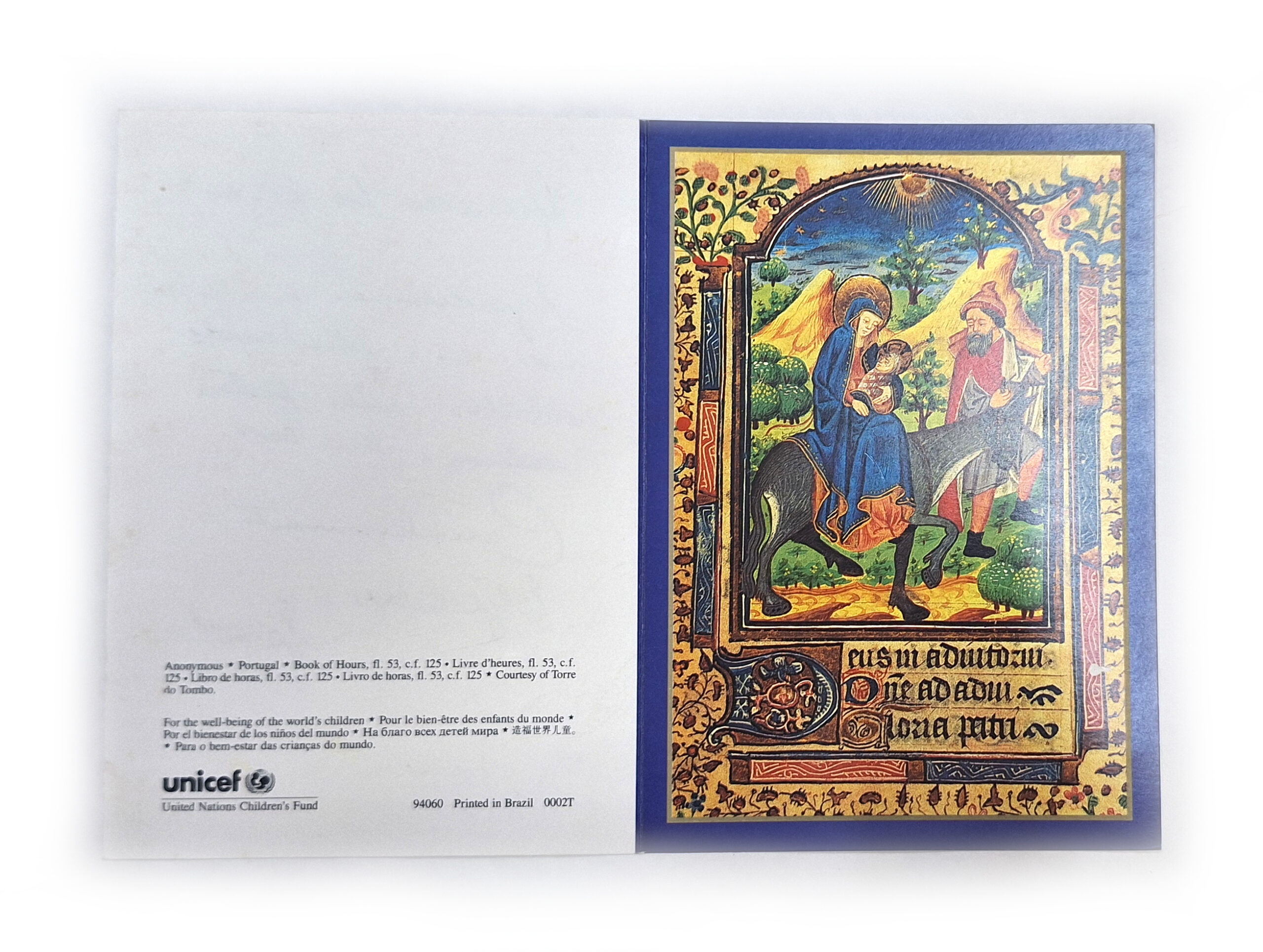 Cartão natalino com imagem colorida da sagrada família e fundo azul. Interior do cartão branco com mensagem escrita à caneta.