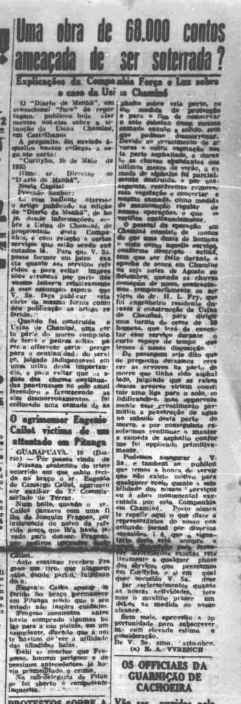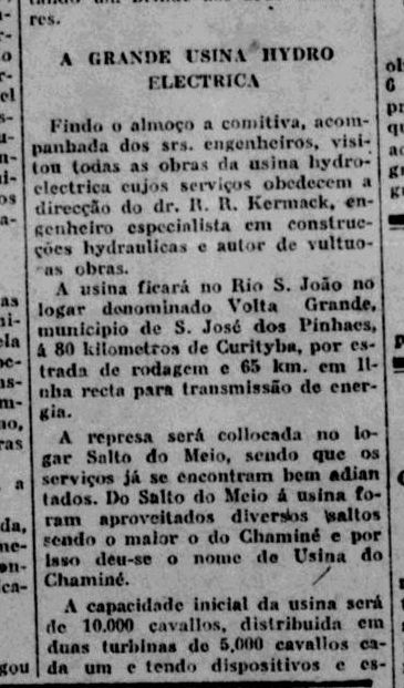 O Jornal “O Dia” publicou uma matéria no ano de 1929 informando qual seria a localização da Hidreletrica, além de trazer o explicação para seu nome, já em 03 de Março 1931 fez um convite ao povo da cidade de Curitiba, esta chamada estimulava todos a comparecerem no evento de inauguração da “Usina do Chaminé” .